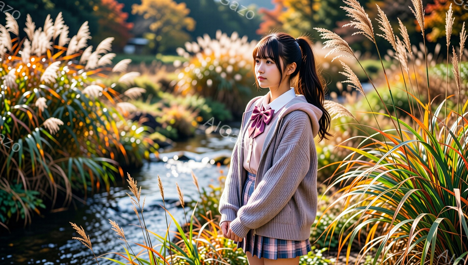 明るい笑顔を浮かべた若い女性が、ピンクと紫のチェック柄のスカートと、淡いピンクのケーブルニットセーターを着ています。彼女は髪をハーフアップにしており、背景にはススキの原と小川、そして遠くに見える建物と紅葉した木々があります。全体的に暖かく、秋の穏やかな雰囲気が漂う写真です。