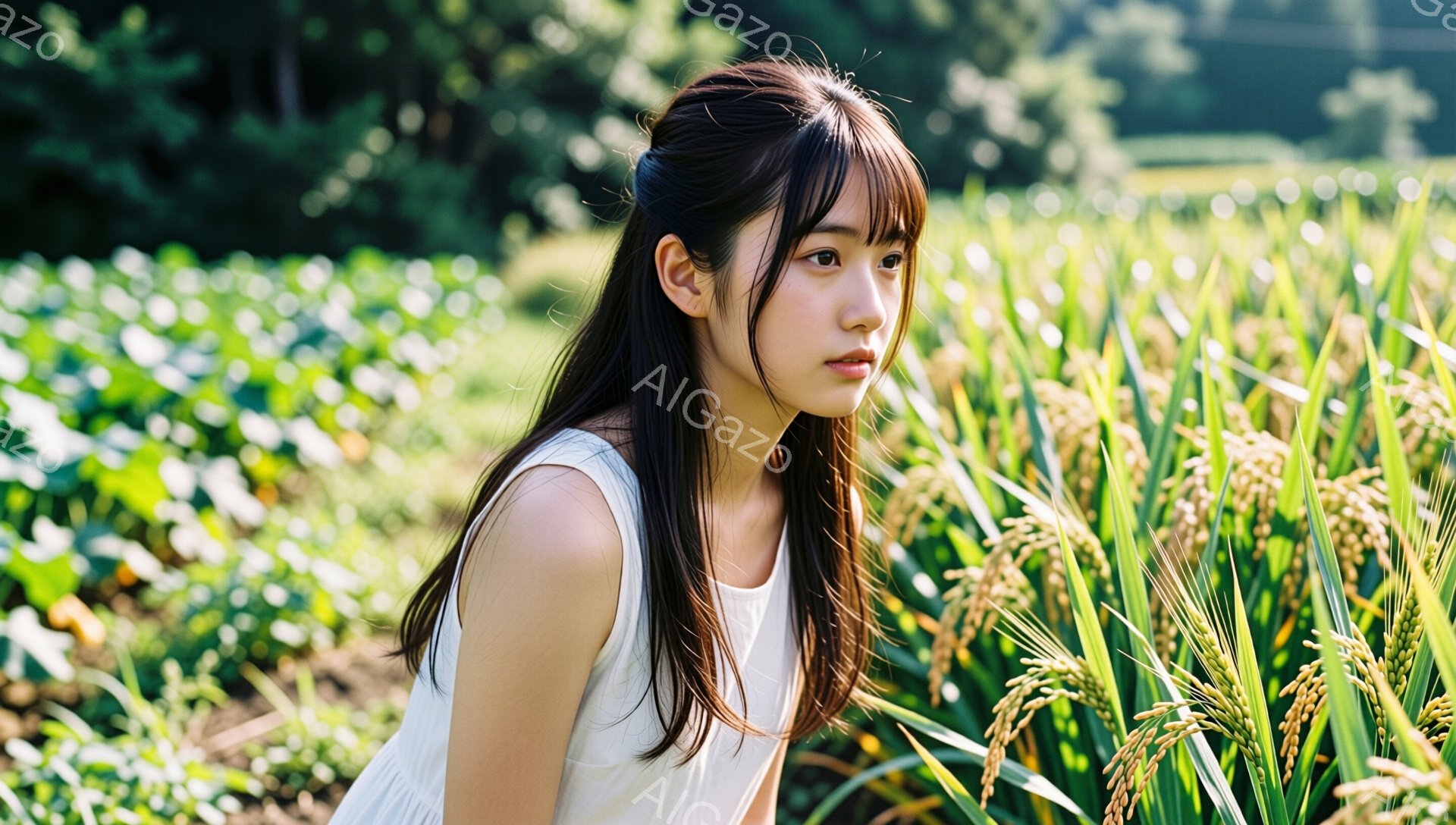 若い女性が田んぼの中に立っている。彼女は薄い緑色のキャミソールワンピースを着ており、長い黒髪は肩にかかっている。彼女の表情はどこか憂いを帯びており、視線は遠くを見つめている。