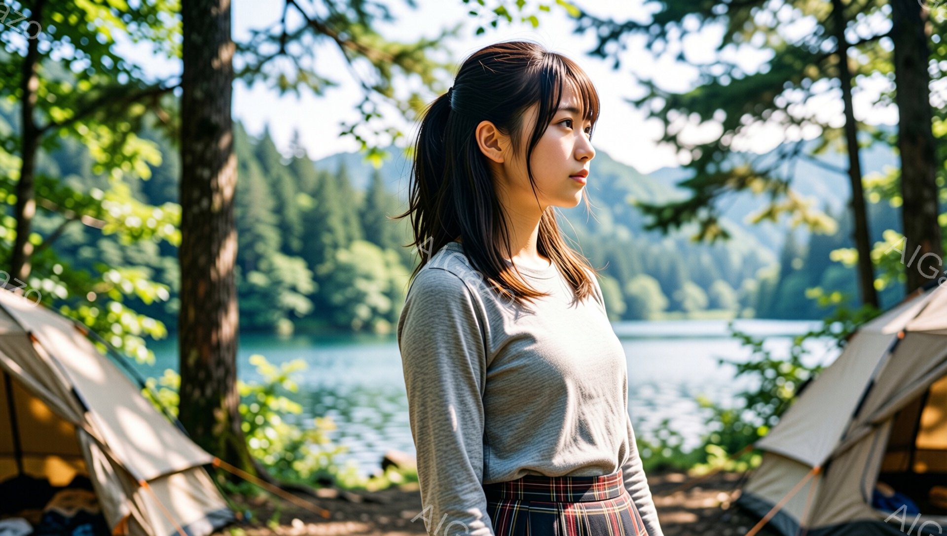長い黒髪を肩のあたりで切り揃えた女性が、グレーの長袖シャツと紺色のスカートを着て立っている。彼女はわずかに顔を左に向け、遠くを見つめるように穏やかな表情をしている。背景には湖と緑豊かな山々が広がり、手前にはキャンプテントが設置されており、晴れた日の自然の中でリラックスした雰囲気が漂っている。