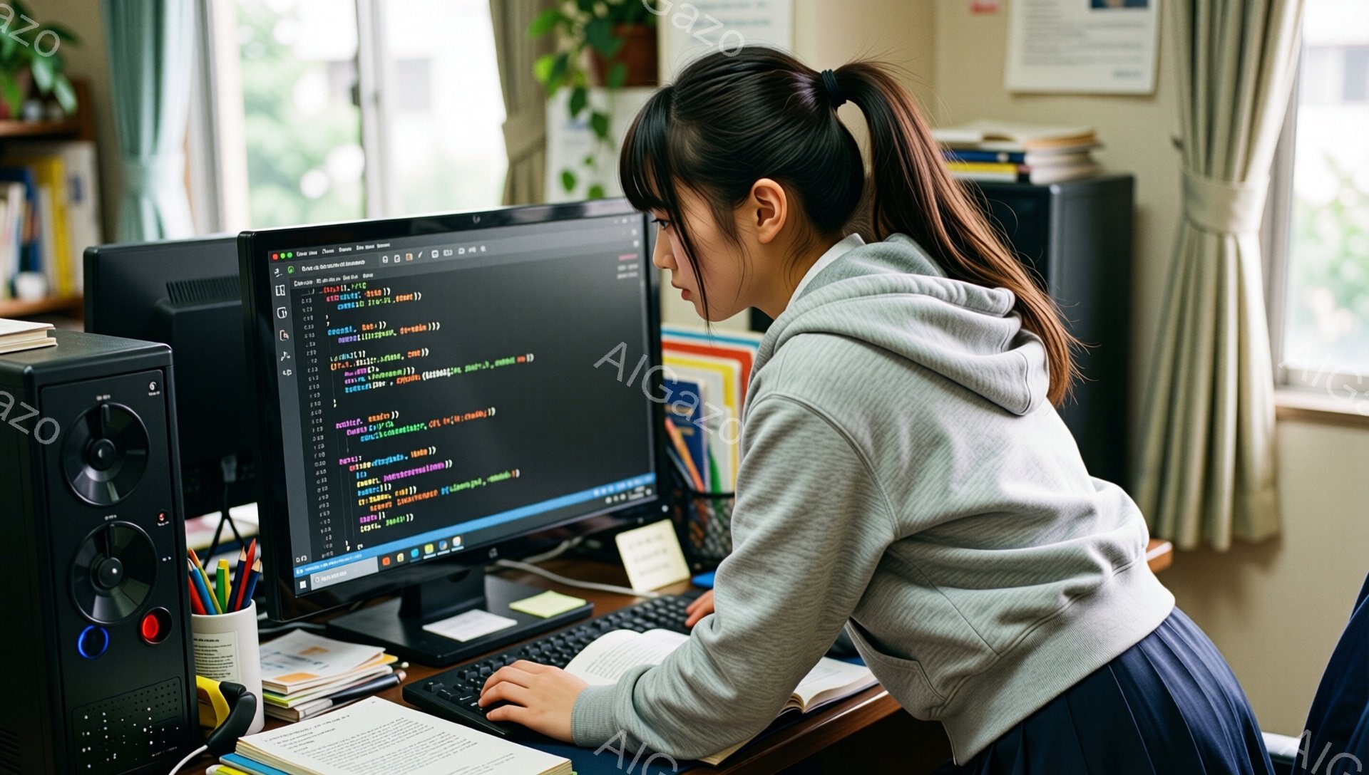 「長い黒髪をポニーテールにした女性が、窓の外を見つめて立っている。ベージュのニットワンピースを着ており、両手を背中に当てている。部屋にはゲーミングPC、モニター、」は、2026年01月07日に作成されたAI生成画像です。 ゲーミングPCをテーマとした高品質なビジュアル素材で、 1920×1088px の解像度で提供しています。 個人利用・商用利用ともに無料でダウンロード可能で、クレジット表記も不要です。