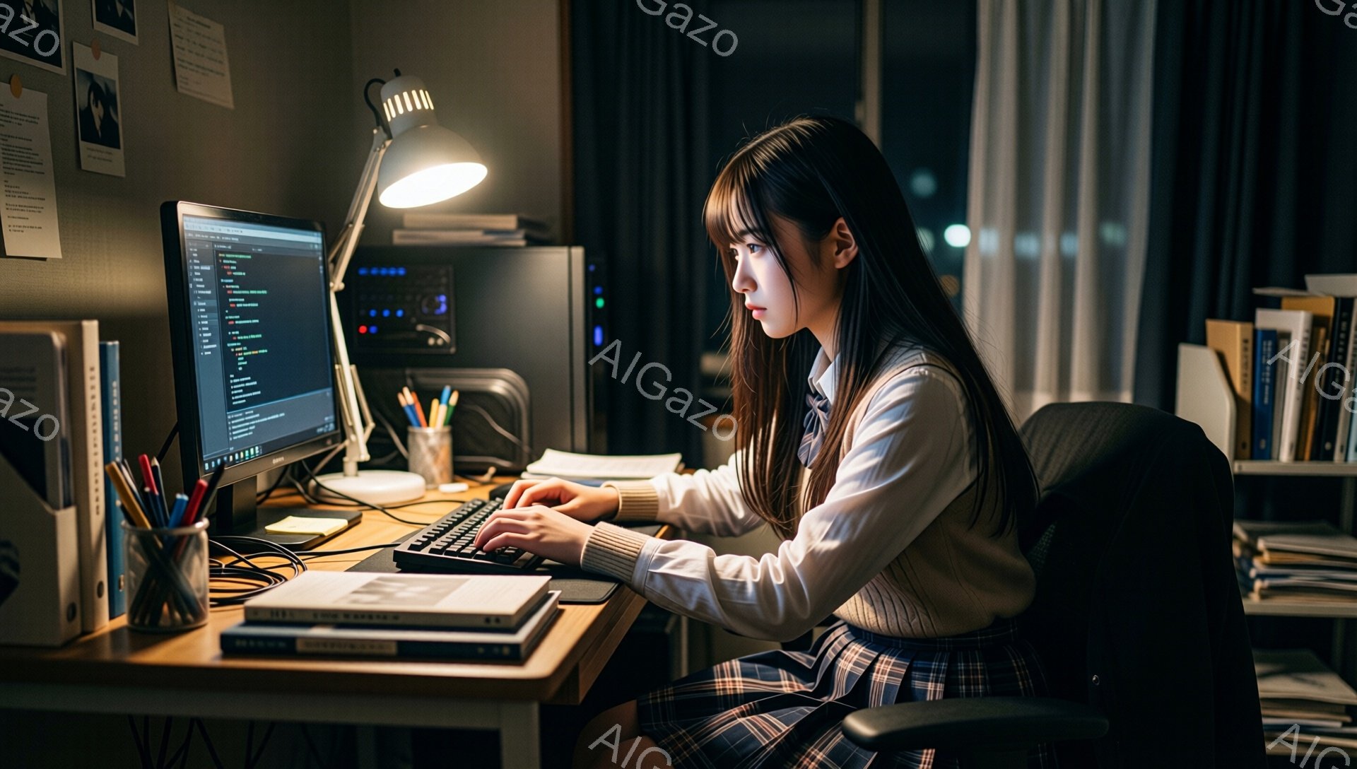 少女はチェック柄のスカートとセーターを着て、パソコンに向かっています。彼女は集中した表情でキーボードを叩き、画面にはプログラミングコードが表示されています。背景には本棚や写真が並び、夜景が薄く見えることから、部屋は暗く、少女は真剣に作業に没頭している様子が伺えます。