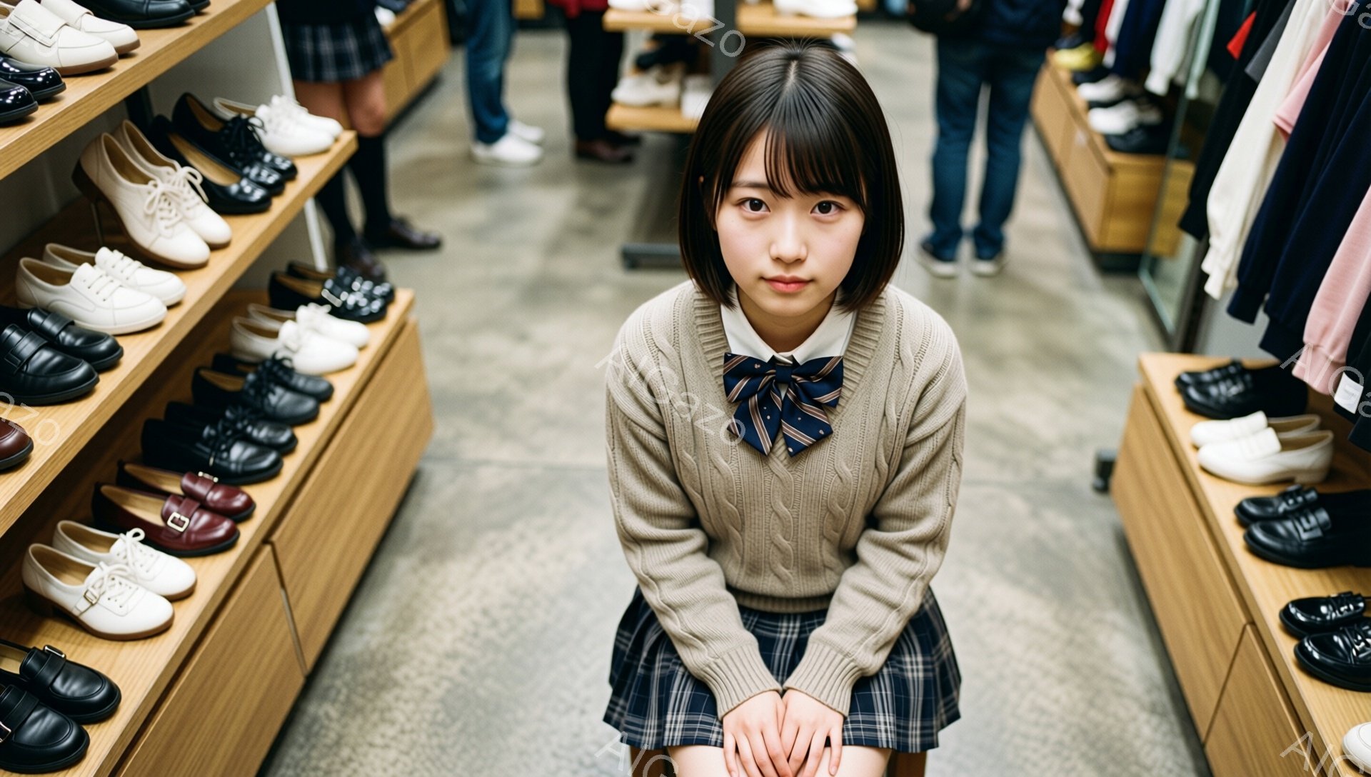 画像は、窓辺に立つ若い女性を捉えています。彼女は茶色のリブニットとロングスカートを身につけ、髪は後ろで結ばれており、顔にはわずかな微笑みが浮かんでいます。背景には、ブーツやニットが並んだ店内の様子が見え、自然光が差し込み、落ち着いた雰囲気が漂っています。