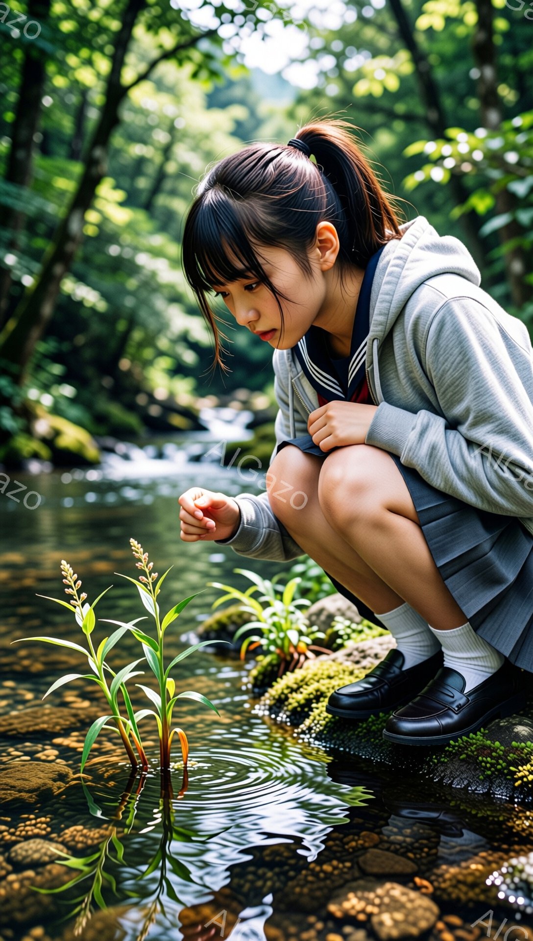 長い前髪と緩やかなウェーブのかかった髪が特徴の若い女性が、膝まで水に浸かって立っている。ベージュ色のゆったりとしたワンピースを着ており、物憂げな表情で何かを見つめている。背景には緑豊かな木々と水面の光の反射があり、穏やかで静謐な雰囲気を醸し出している。