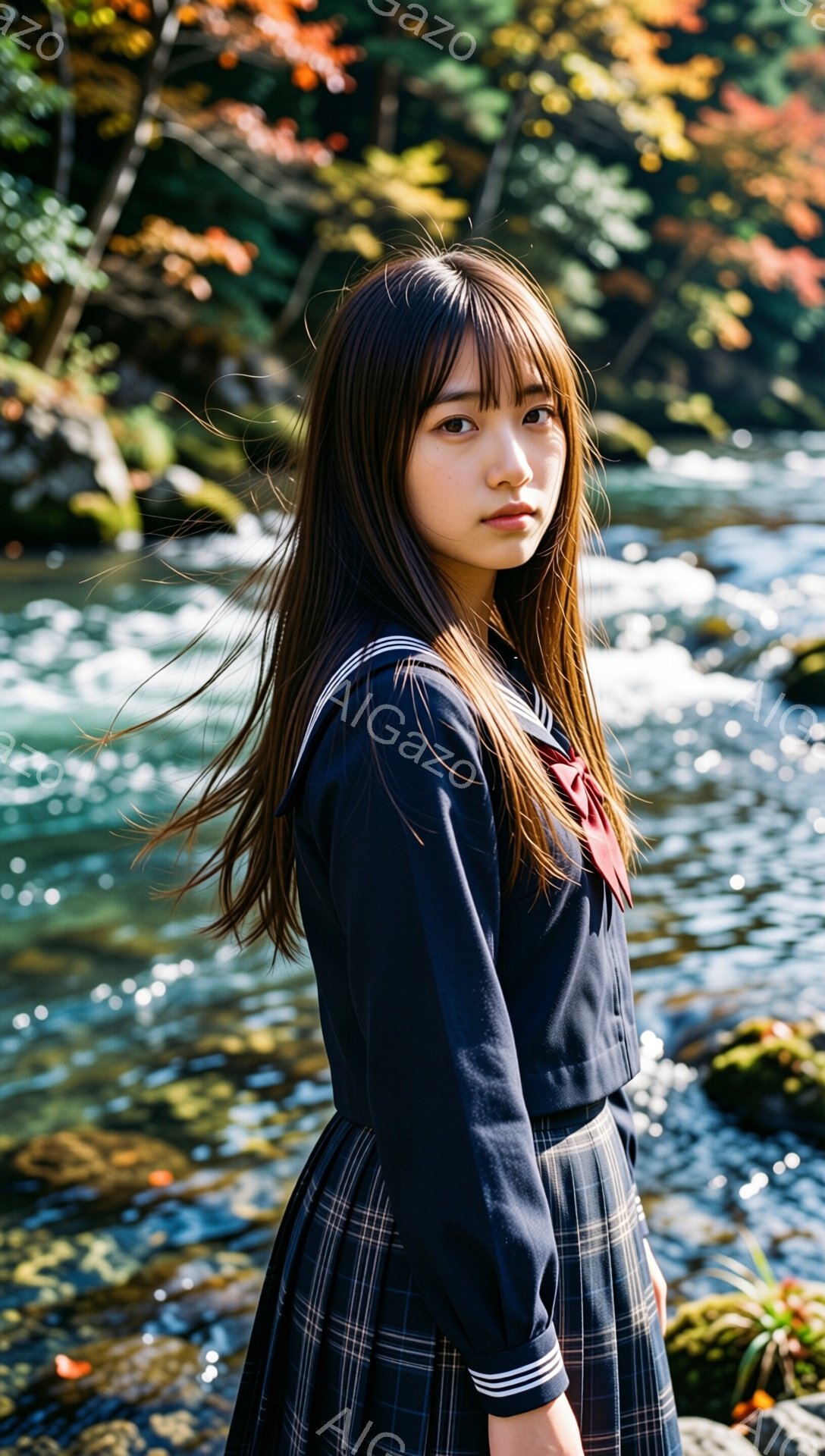 長い黒髪をなびかせ、紺色のセーラー服にチェック柄のスカートを身につけた女性が写っている。彼女はわずかに微笑み、少し伏し目がちで、どこか物憂げな表情をしている。背景には、水が流れる自然豊かな風景が広がり、秋の紅葉がうっすらと見える。