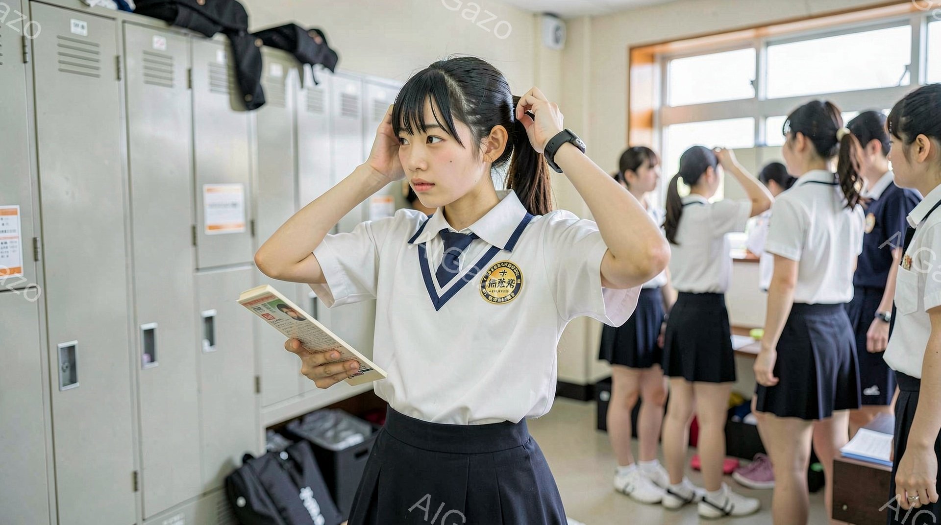 A female student in uniform is tying up her hair in what appears to be a gymnasium or changing room. She’s wearing a white blouse, a black skirt, and a navy blue cardigan, smiling brightly as she looks forward. The background features lockers, gym equipment, and scattered shoes, creating a lively atmosphere of a post-physical education class.