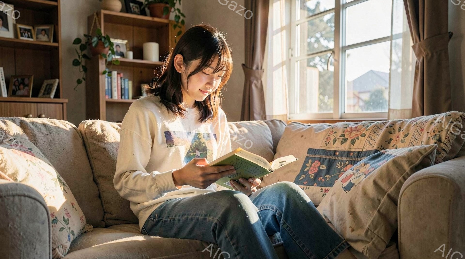 明るい日差しの差し込むリビングで、若い女性がソファに座って本を読んでいます。彼女はグレーのセーターと濃い色のズボンを着用し、肩までの長さの髪を無造作にまとめています。背景には観葉植物や絵画が見え、穏やかでリラックスした雰囲気が漂っています。