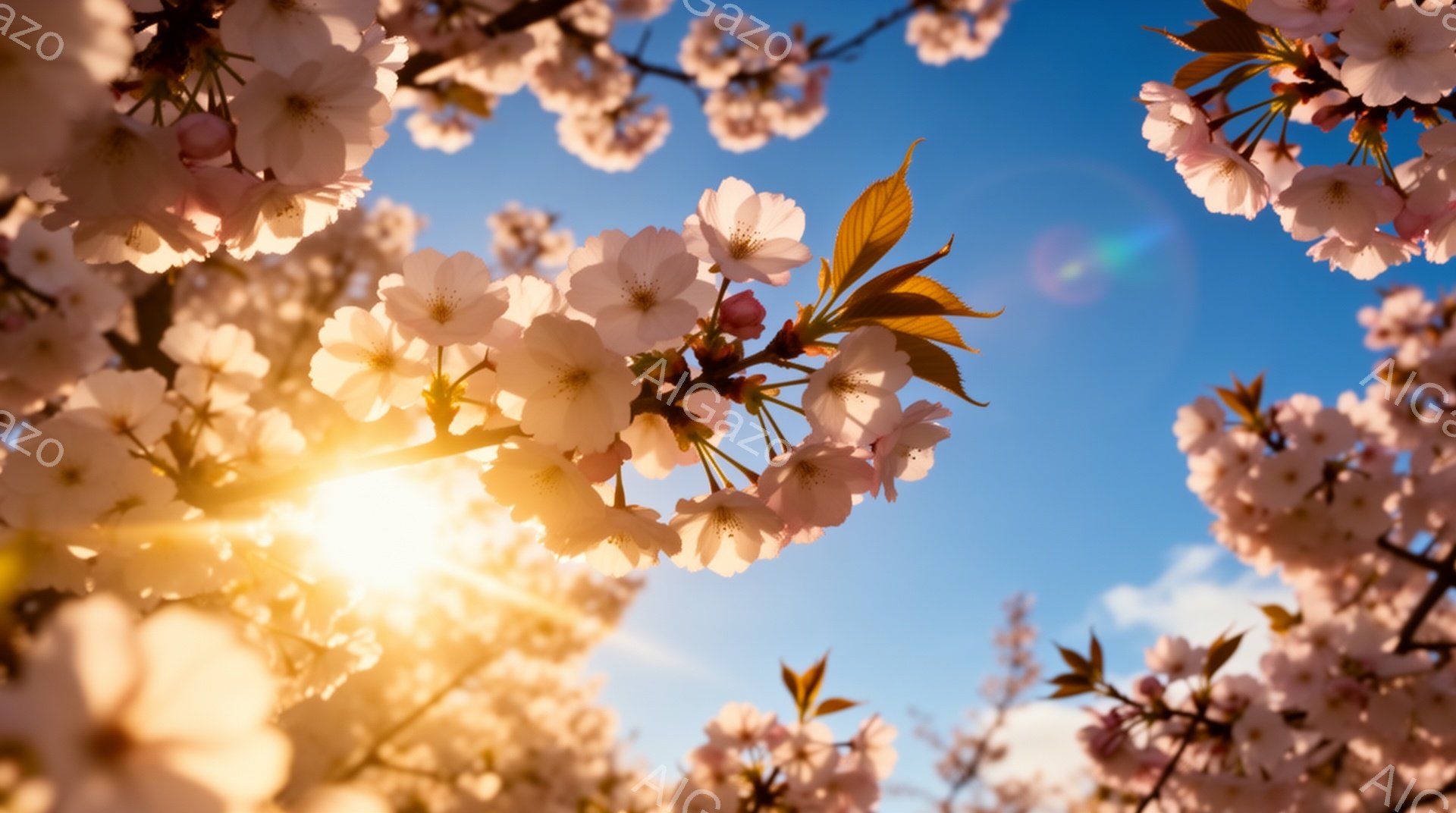 鮮やかな青空を背景に、桜の花が満開の様子が捉えられています。太陽の光が桜の花びらを照らし、明るく華やかな雰囲気を醸し出しています。花びらの淡いピンクと青空のコントラストが美しく、春の訪れを感じさせます。