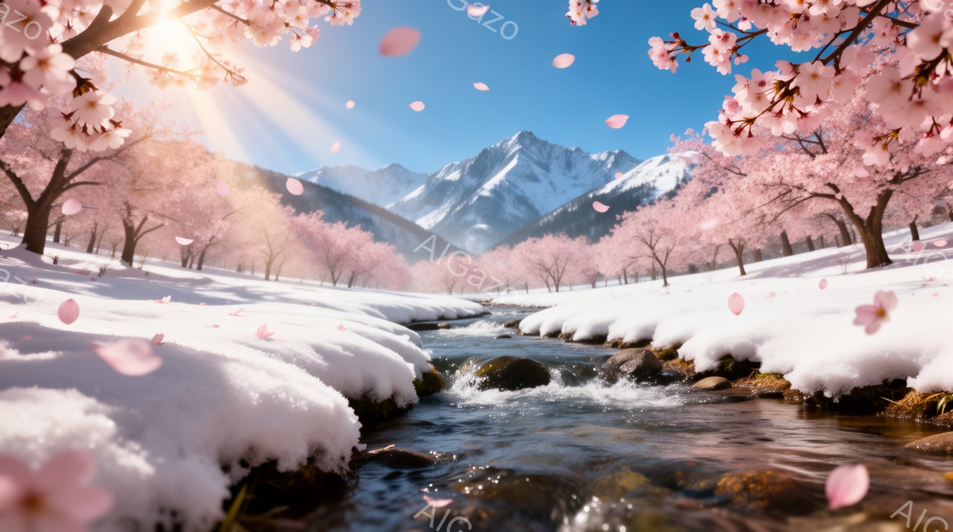 雪に覆われた風景の中に、桜が咲き誇る川が流れています。遠くには雪を頂いた山々が連なり、桜の花びらが舞い散ることで春の訪れを感じさせる、穏やかで美しい光景です。水面はキラキラと輝き、自然の優しさと力強さを表現しています。