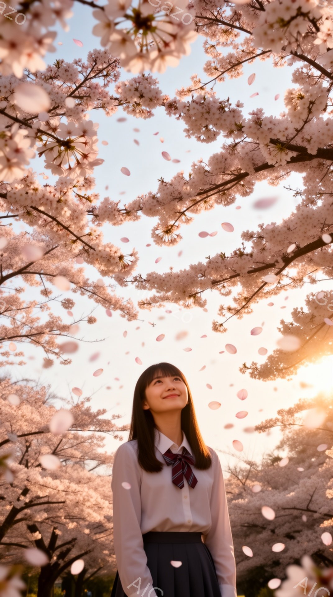 The young woman looks up at the sky amidst falling cherry blossoms. She wears a school uniform consisting of a beige sweater, a checkered tie, and a pleated skirt, with long, straight black hair. Behind her stretches a row of cherry trees, backlit to make the petals sparkle, creating a warm and peaceful spring atmosphere.