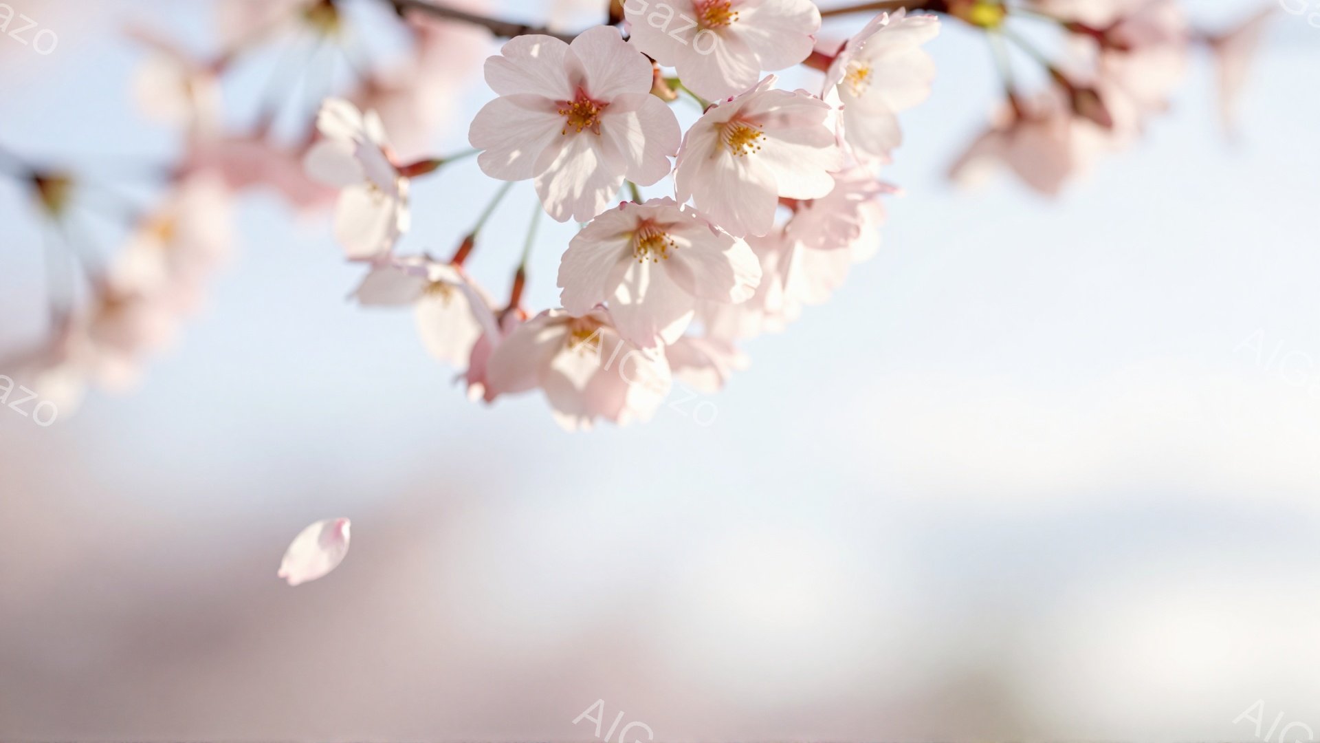 空を見上げると、桜の花びらが咲き乱れ、まるでトンネルのようになっている。鮮やかな青空を背景に、淡いピンク色の桜が春の暖かさと優しさを表現している。太陽の光が花びらを照らし、幻想的な雰囲気を醸し出している。