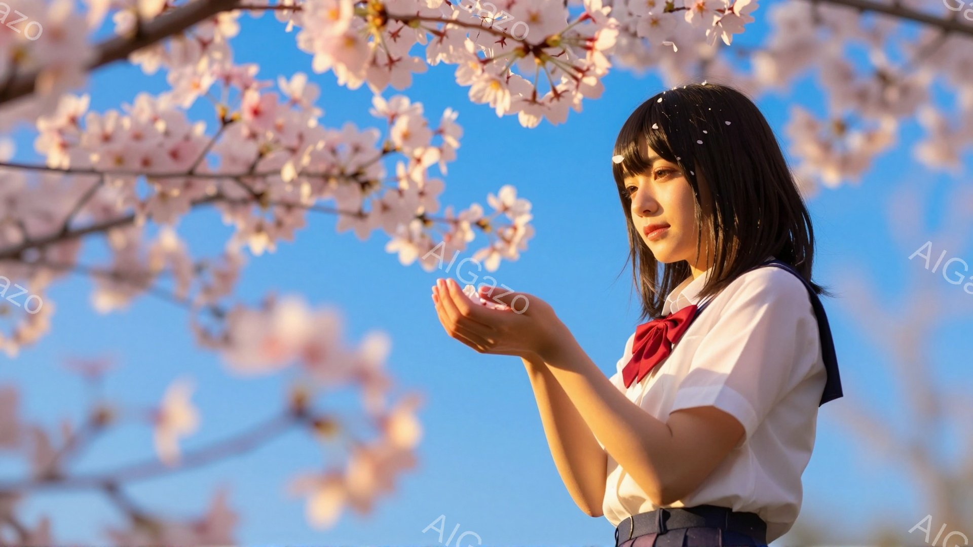The girl is posed with her hands outstretched, as if catching falling cherry blossom petals in a scene filled with blooming sakura. She’s wearing a sailor uniform with a navy ribbon and white trim, and her shoulder-length hair is styled with bangs slightly swept to the side. Behind her is a full bloom of cherry blossoms under a clear blue sky, creating a peaceful and spring-like atmosphere.