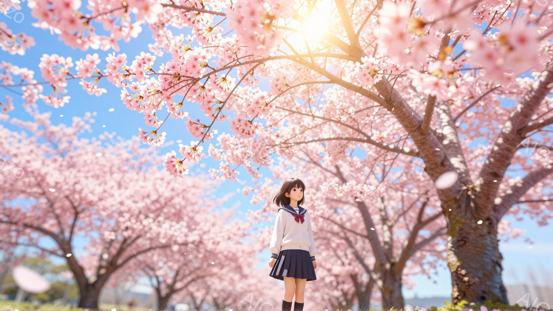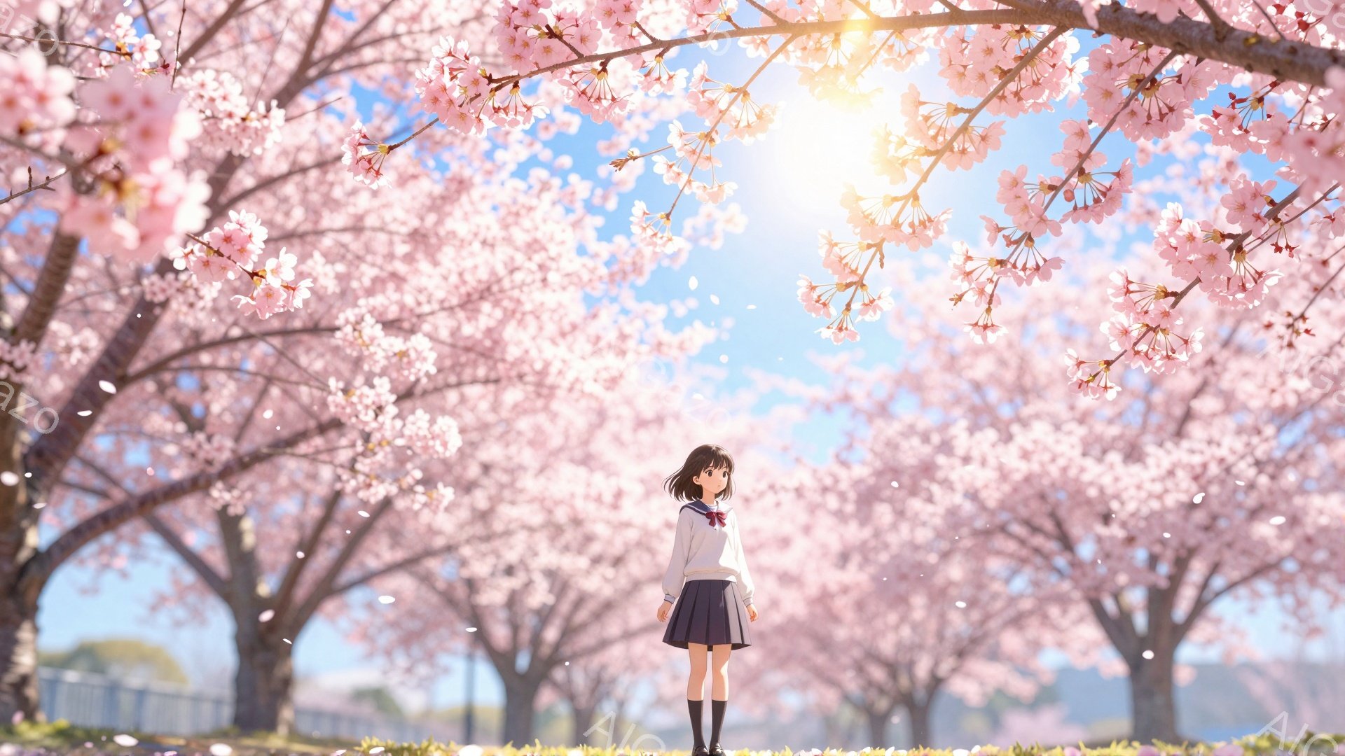 画像には、桜並木の下に立つ少女が描かれています。彼女はセーラー服を着ており、黒髪を後ろで結んでいます。背景は満開の桜で、空は晴れており、暖かく穏やかな春の日の雰囲気が漂っています。