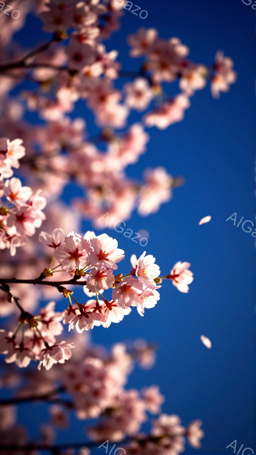 花と花びらの要素を持つAI生成画像「鮮やかな青空を背景に、桜の花びらが舞い散る様子が捉えられています。薄桃色の桜の花は満開で、枝いっぱいに咲き誇り、春の暖か」。 Z Imageによって2026年02月に生成されました。 解像度は 1080×1920px で、 ウェブサイトやSNS投稿に最適なサイズです。 商用利用OK・会員登録不要・クレジット表記不要で無料ダウンロードできます。