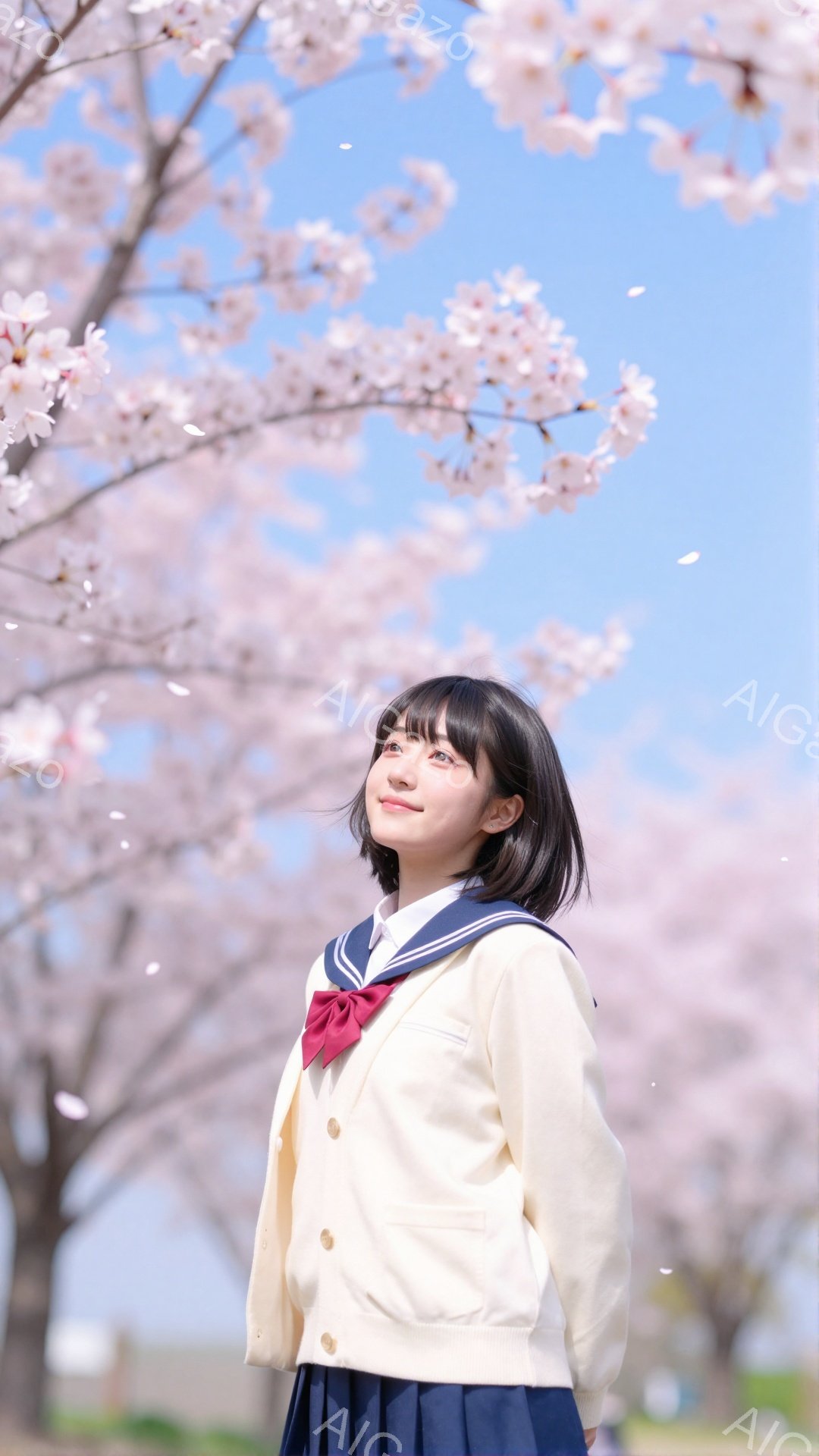 スカートとブレザーの要素を持つAI生成画像「彼女は桜の花びらが舞う中で、ベージュ色のブレザーと紺色のスカートの制服を着ています。短く切りそろえられた黒髪は、少し内側」。 Z Imageによって2026年02月に生成されました。 解像度は 1080×1920px で、 ウェブサイトやSNS投稿に最適なサイズです。 商用利用OK・会員登録不要・クレジット表記不要で無料ダウンロードできます。