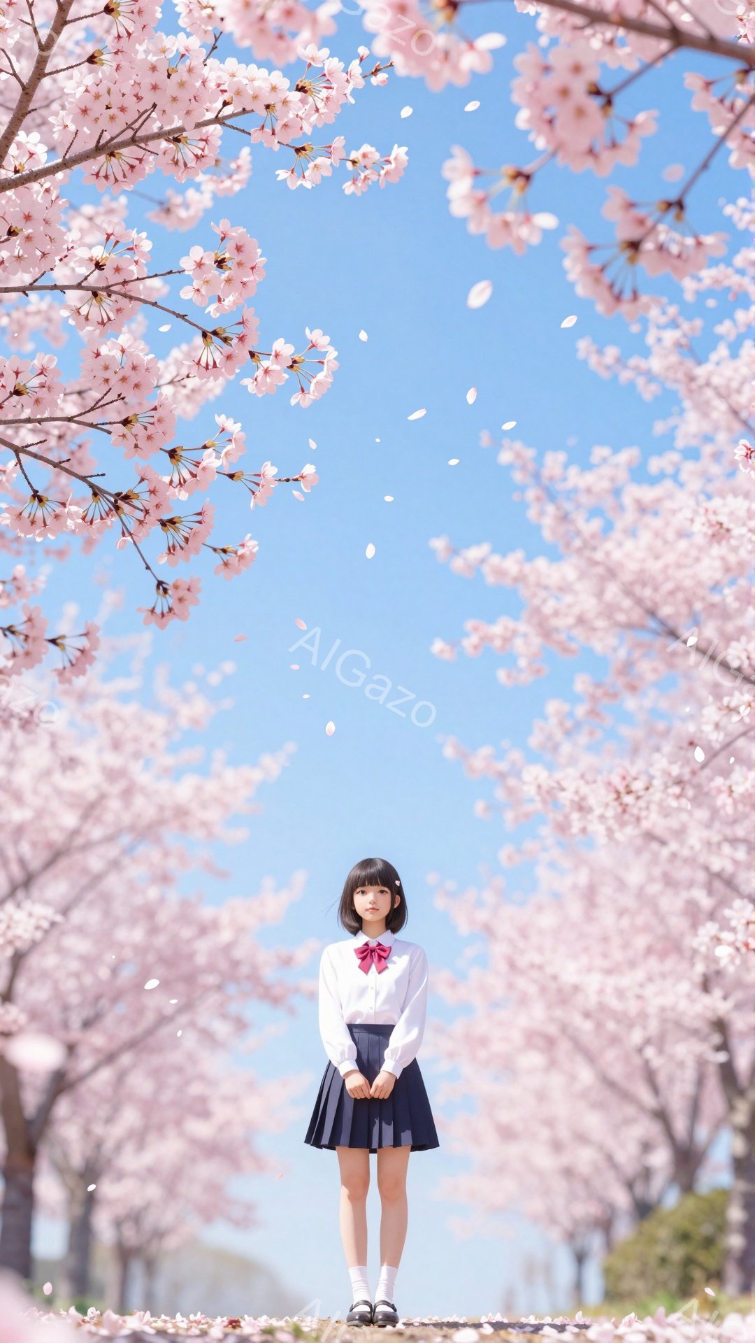 制服を着た若い女性が桜並木の真ん中に立っている。彼女は白いセーターに紺色のスカート、そして赤いリボンを締めた制服姿で、黒い靴を履いている。彼女は前を見据え、少し微笑んでいるように見え、背景の桜の花びらが舞い散る美しい春の風景が広がっている。
