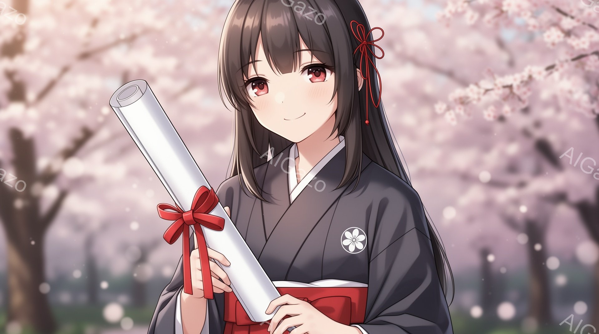 少女は白い着物に赤い帯を締めており、黒髪を肩まで伸ばした髪型に整えています。彼女は両手に巻物を抱え、少し微笑んでおり、卒業式などの晴れやかな行事に参加している様子が伺えます。背景には桜が咲き誇り、春らしい穏やかで華やかな雰囲気を醸し出しています。