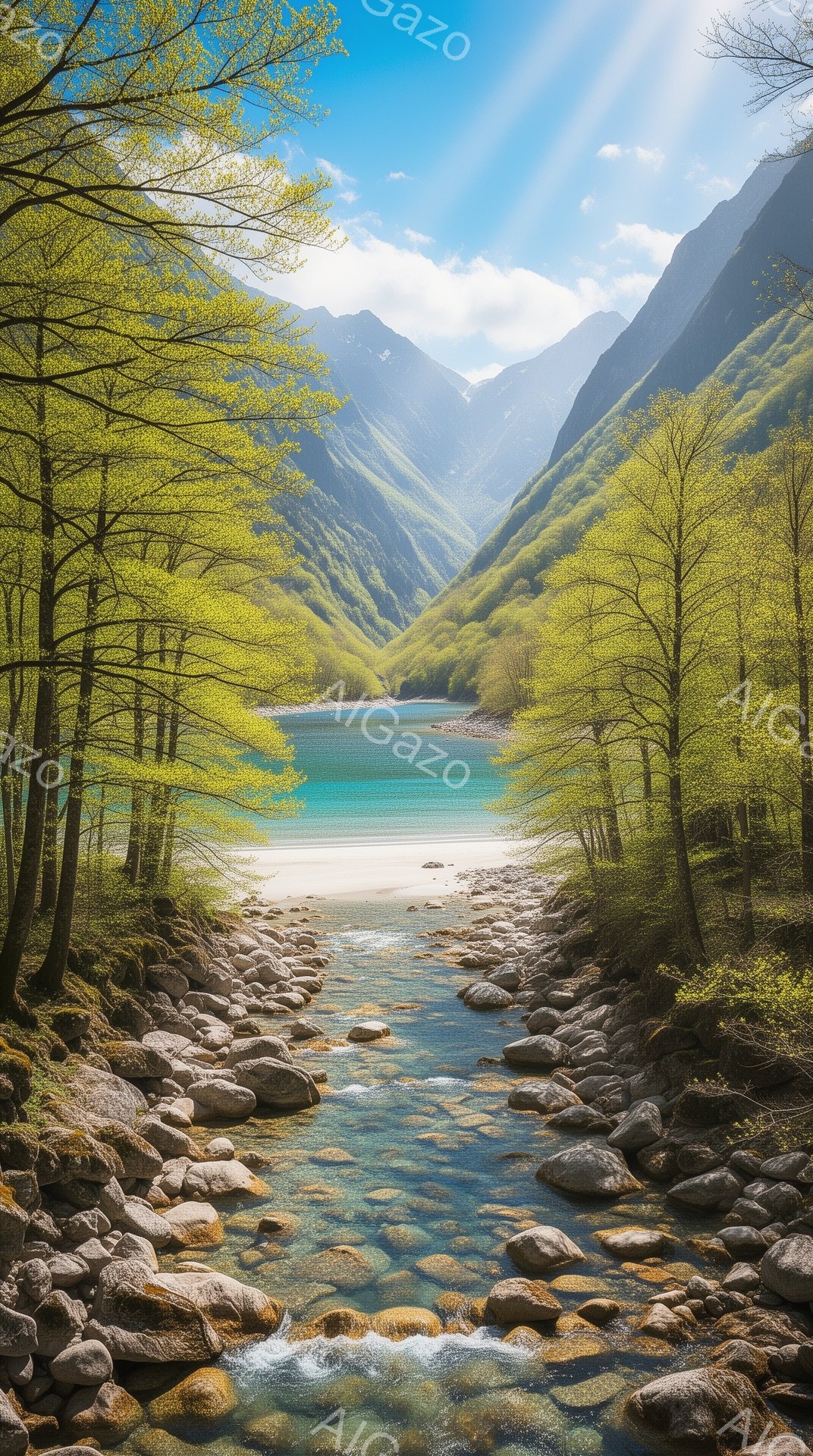 緑豊かな山々に囲まれた、ターコイズブルーの湖へと続く小川が印象的な風景です。湖の周囲は緑の木々が生い茂り、遠くには雪を抱いた山々が見えます。光が差し込み、穏やかで神秘的な雰囲気を醸し出しています。