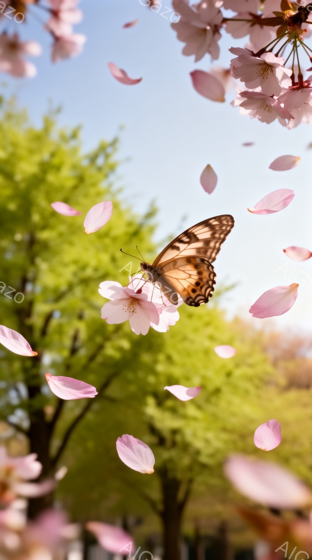 桜の花びらが舞い散る中、鮮やかな黄と黒の模様をしたアゲハチョウが羽ばたき、一輪の桜の花にとまっている。背景には新緑の木々が広がり、澄み切った青空が広がっている。春の穏やかで幻想的な雰囲気が漂う、美しい瞬間を捉えた写真である。