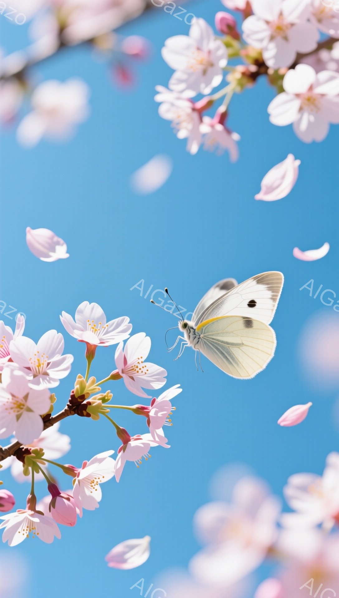 桜の花びらが舞い散る青空の下、白い蝶がひらひらと舞っている。花々は淡いピンク色で、春の暖かさと軽やかさを感じさせる。背景は明るい青空で、蝶と桜の花びらが美しく調和している。