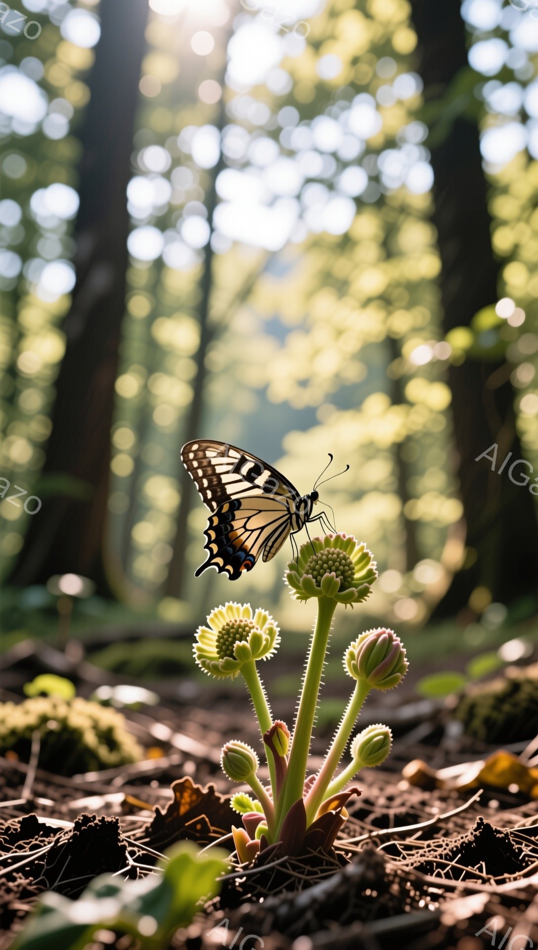 A vibrant orange butterfly rests delicately on a small, green succulent plant. The background is a blurred forest, illuminated by shafts of sunlight, creating a whimsical atmosphere. The delicate details of the plant and the butterfly’s bright colors are particularly striking.