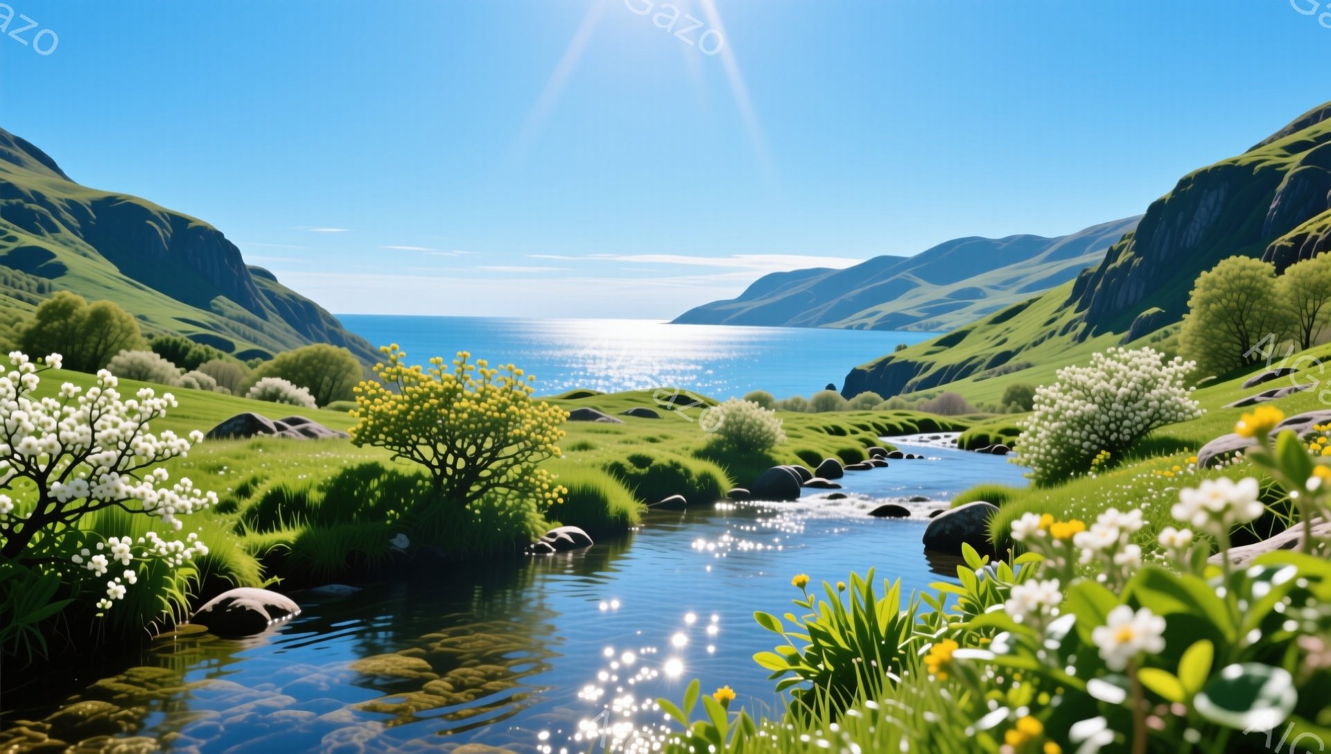 A beautiful landscape featuring a stream flowing through rolling hills and leading towards the sea. White flowers are blooming abundantly, creating a lush and green natural environment. The light reflecting on the water surface creates a peaceful and serene atmosphere.