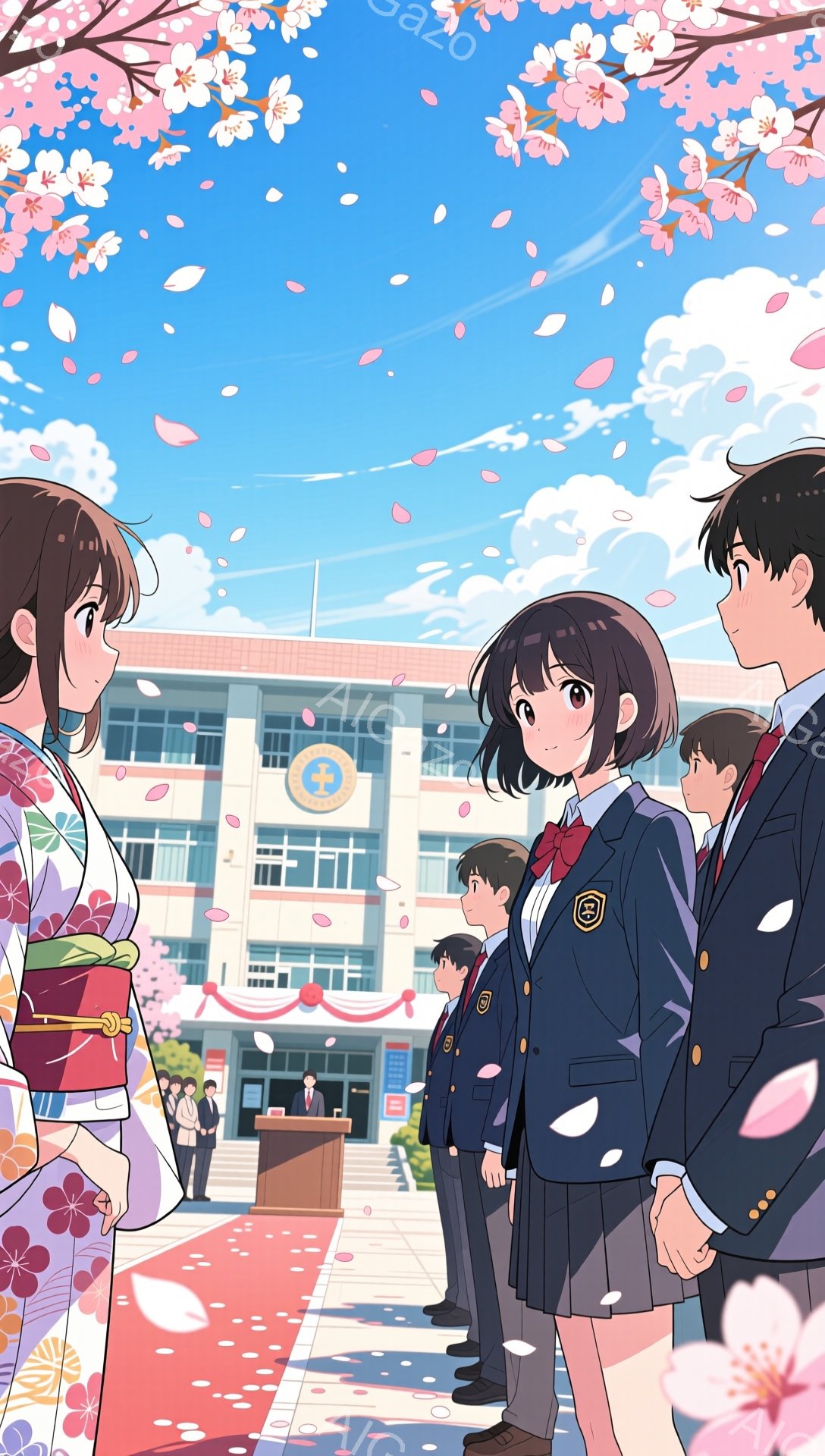 制服を着た少女が正面を見据え、桜の花びらが舞う学校の前に立っている。彼女は短い黒髪で、表情は少し緊張しているようにも見える。背景には、他の生徒たちが着物姿で並び、入学式や卒業式などの特別なイベントが行われている雰囲気が漂っている。