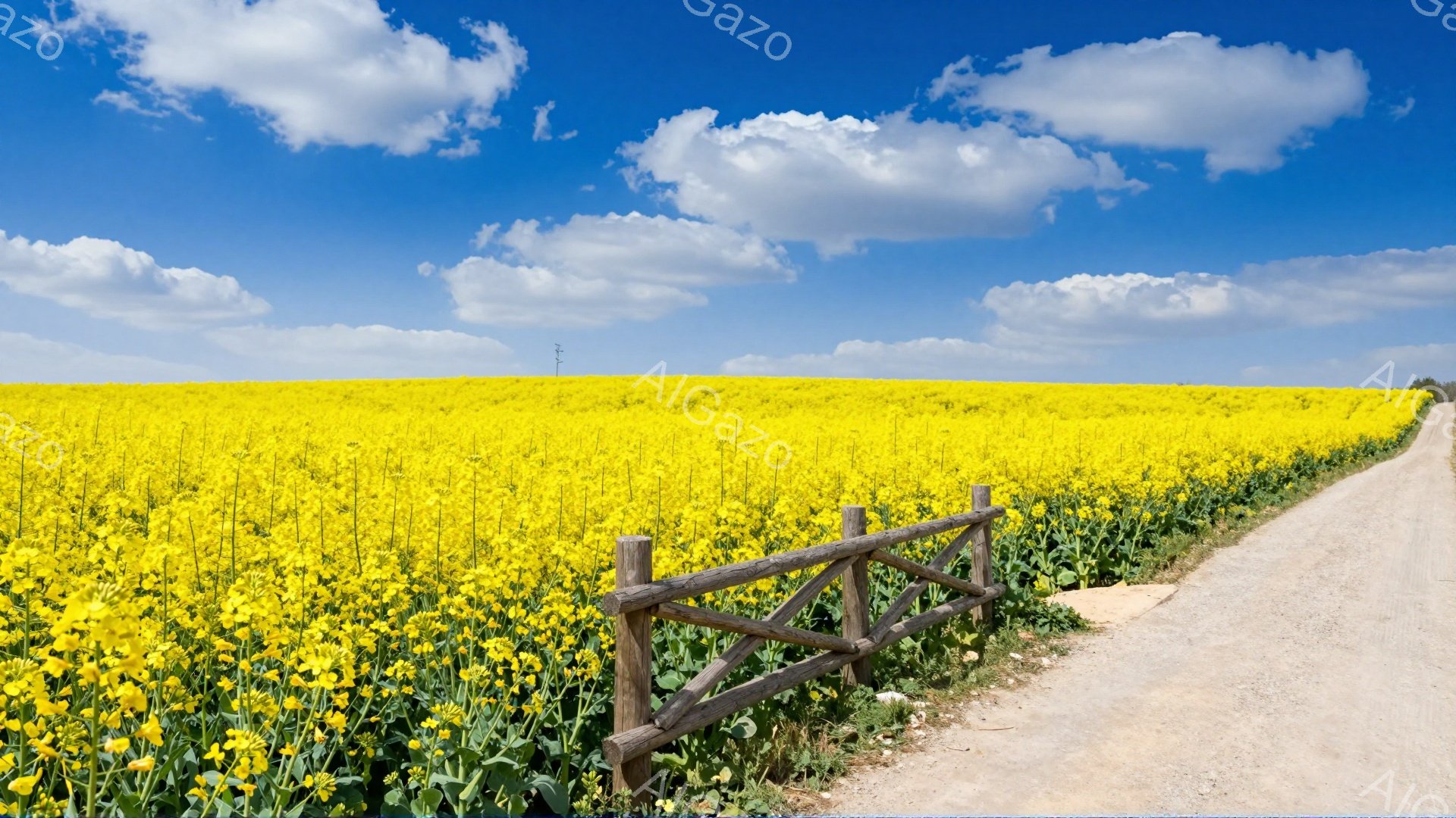 A path lined with a wooden fence stretches through a vast field of rapeseed flowers. The blue sky is dotted with white clouds, creating a bright and peaceful spring scene. The vibrant yellow of the rapeseed flowers is striking and evokes a sense of tranquility.