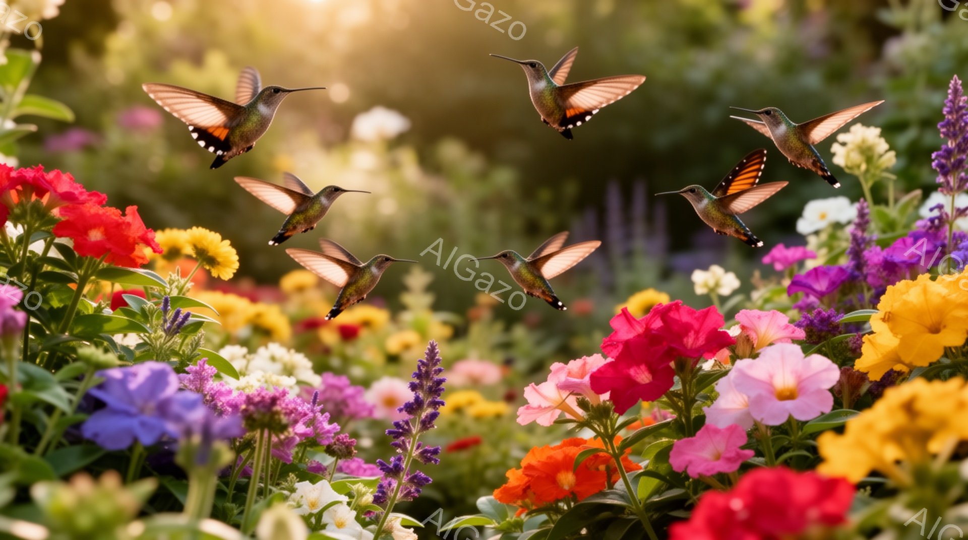 色とりどりの花々が咲き乱れる庭で、二羽のハチドリが蜜を求めて飛び回っている。鮮やかな色彩とぼやけた背景が、夢幻的な雰囲気を醸し出している。ハチドリの羽は光を浴びて虹色に輝き、生命力にあふれている。
