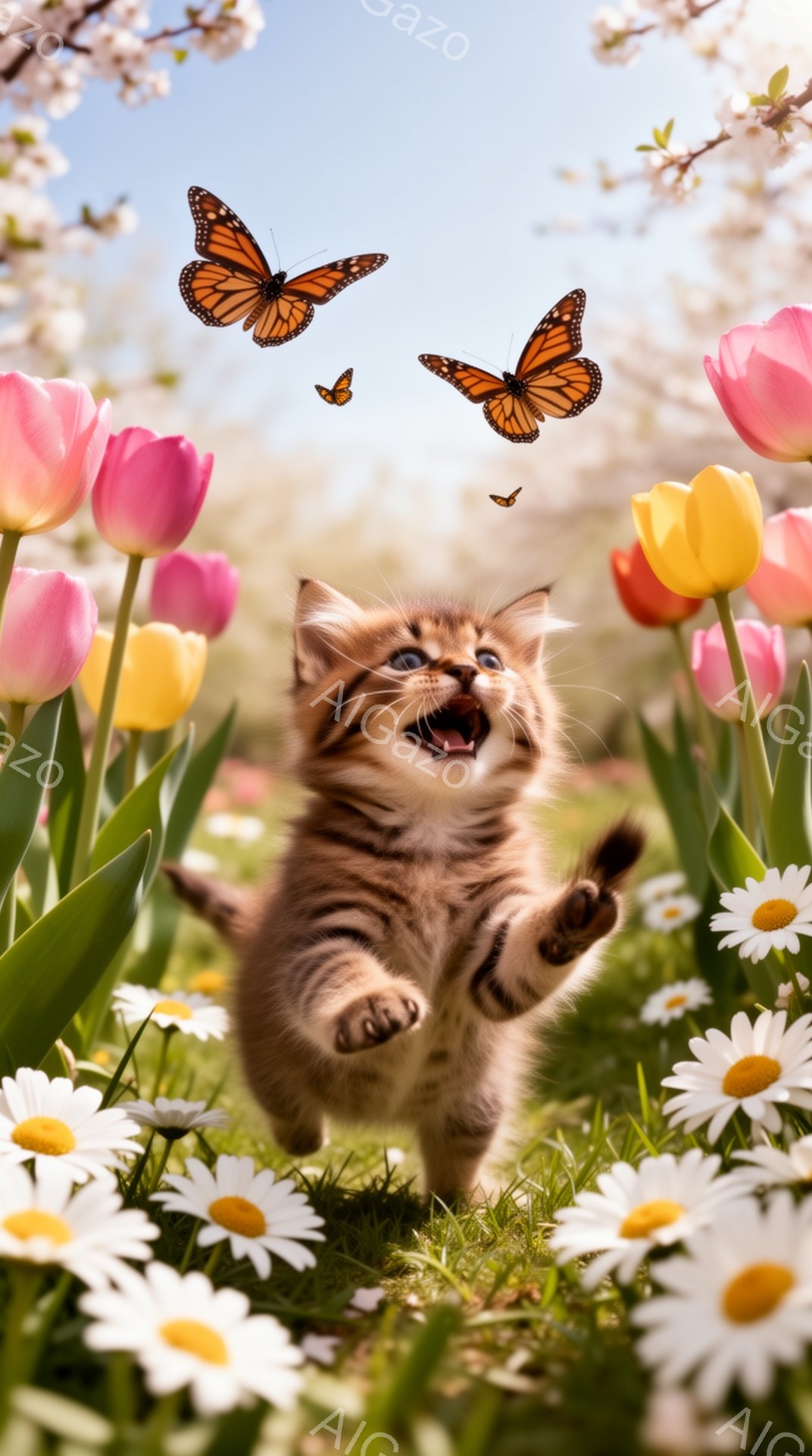 小さな子猫が、春の草花の間で蝶を追いかけている。緑の草原に咲く色とりどりの花々と、ふわふわの毛並みを持つ子猫の姿が愛らしい。暖かく明るい雰囲気で、春の喜びが感じられる。
