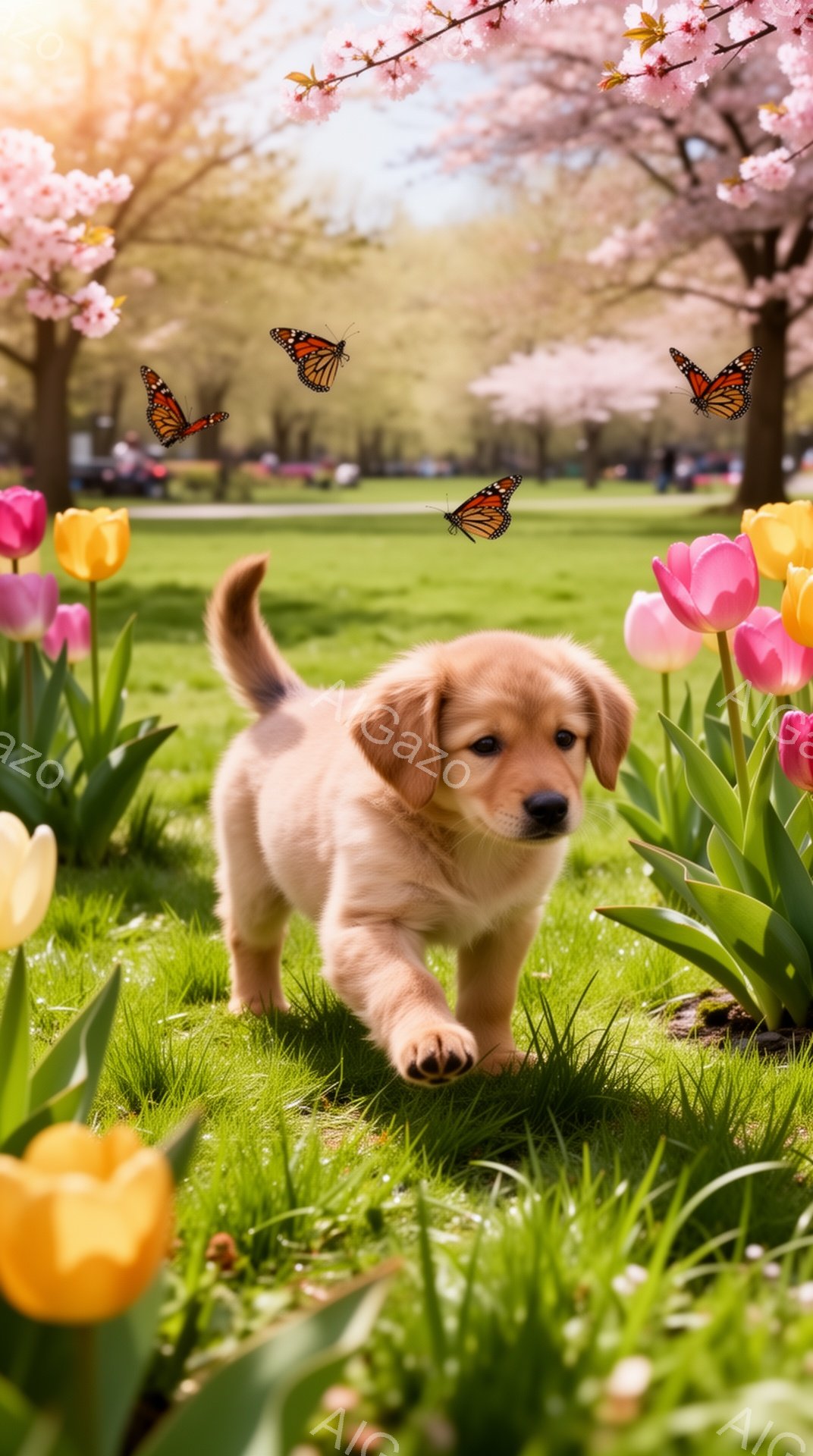 鮮やかな春の庭で、小さな子犬が蝶を追いかけて遊んでいます。周囲には色とりどりのチューリップが咲き誇り、背景には桜の木がぼんやりと見えます。暖かく穏やかな雰囲気で、春の喜びが感じられます。
