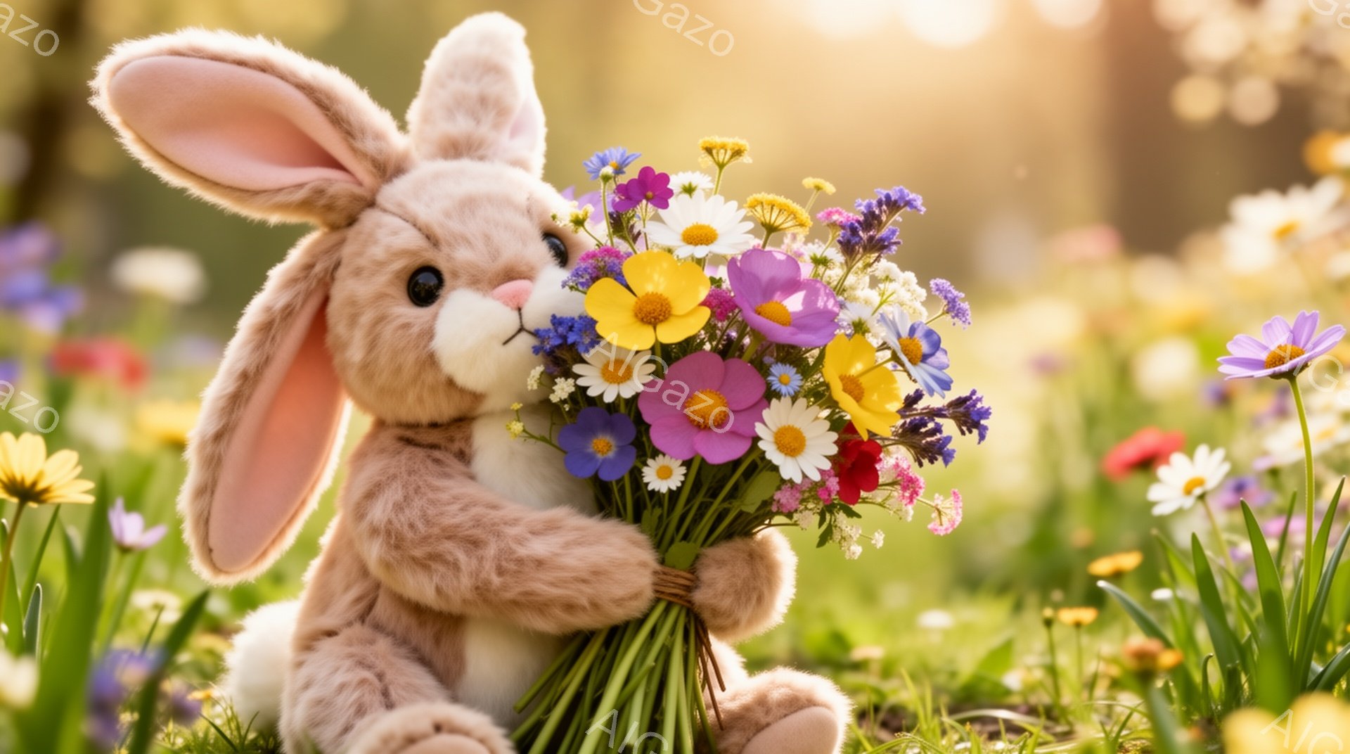 A fluffy rabbit is embracing a vibrant bouquet of flowers. It is surrounded by a meadow filled with similar blossoms, bathed in warm springtime sunlight. The cute rabbit and flowers create a peaceful and gentle atmosphere.