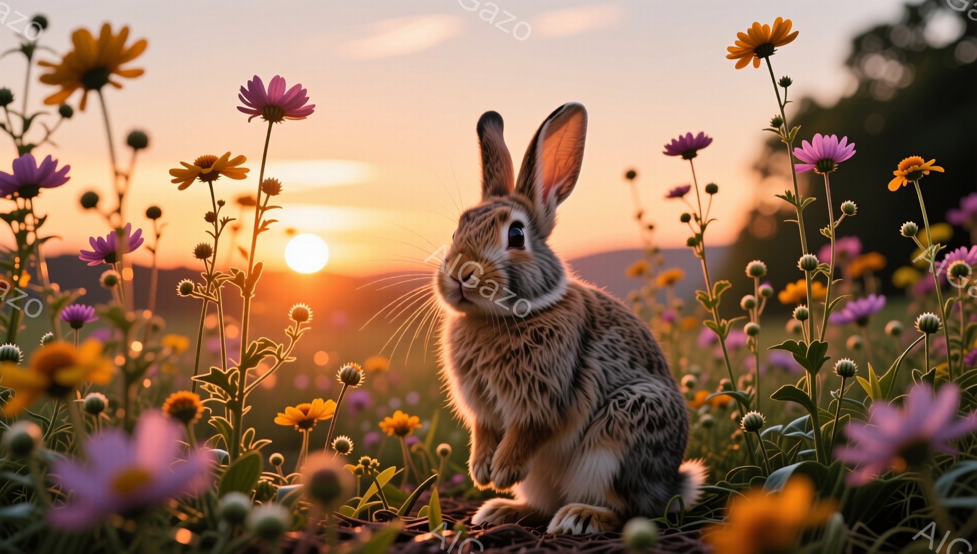 A charming brown rabbit sits amongst a field of colorful wildflowers, bathed in the warm glow of a sunset. The rabbit is sitting upright with its paws neatly placed in front, gazing gently towards the viewer. The vibrant flowers and soft light create a peaceful and whimsical atmosphere.