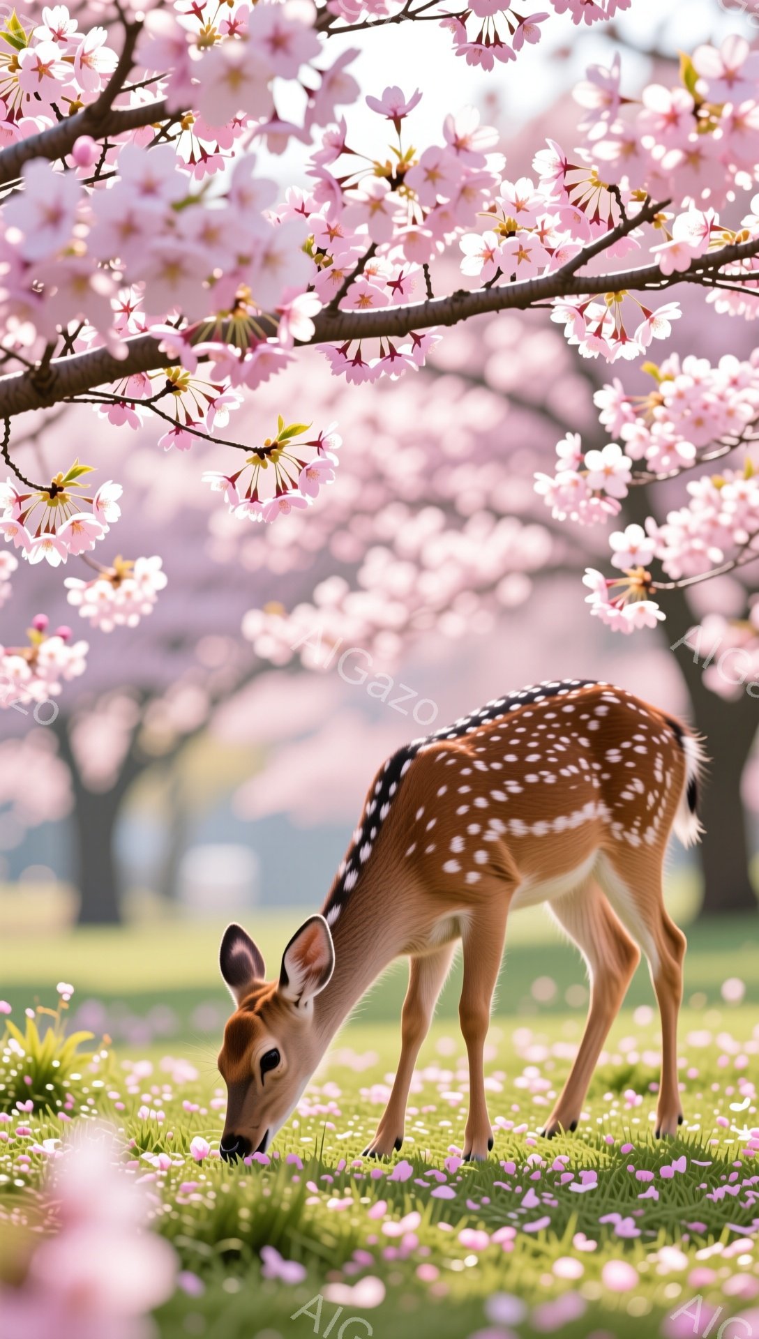 桜並木の下で、子鹿が草を食べている。春の柔らかい光が降り注ぎ、穏やかで優しい雰囲気が漂っている。ピンク色の花びらが舞い散り、夢のような風景を作り出している。