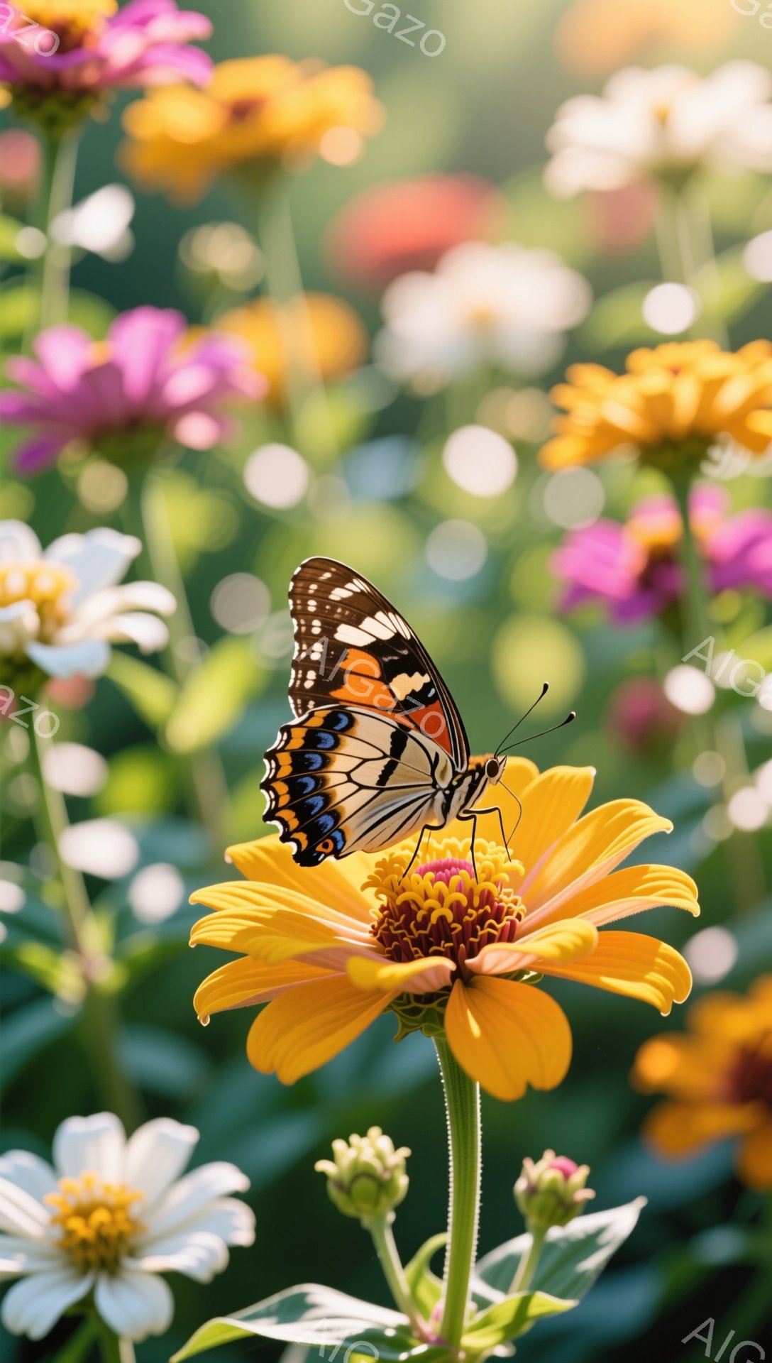 鮮やかな黄色い花に黒い縞模様の蝶がとまっています。背景にはさまざまな色の花が咲き乱れ、夏の庭の活気を感じさせます。柔らかい光が全体を照らし、穏やかで平和な雰囲気を醸し出しています。