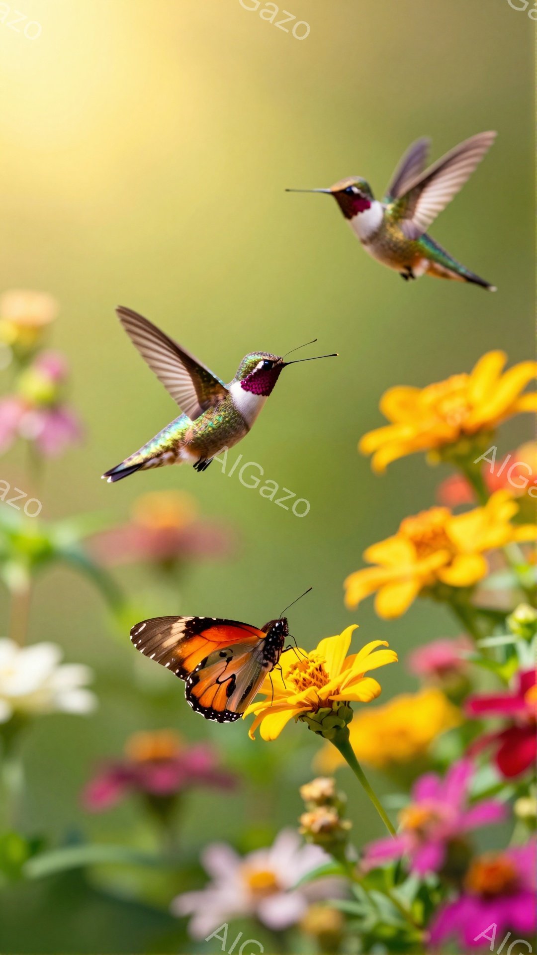 色とりどりの花々が咲き乱れる庭で、2羽のハチドリが花の蜜を求めて飛び回っています。鮮やかな色彩と躍動感あふれる姿は、夏の生命力を感じさせます。背景には緑豊かな植物が広がり、自然の美しさが際立っています。