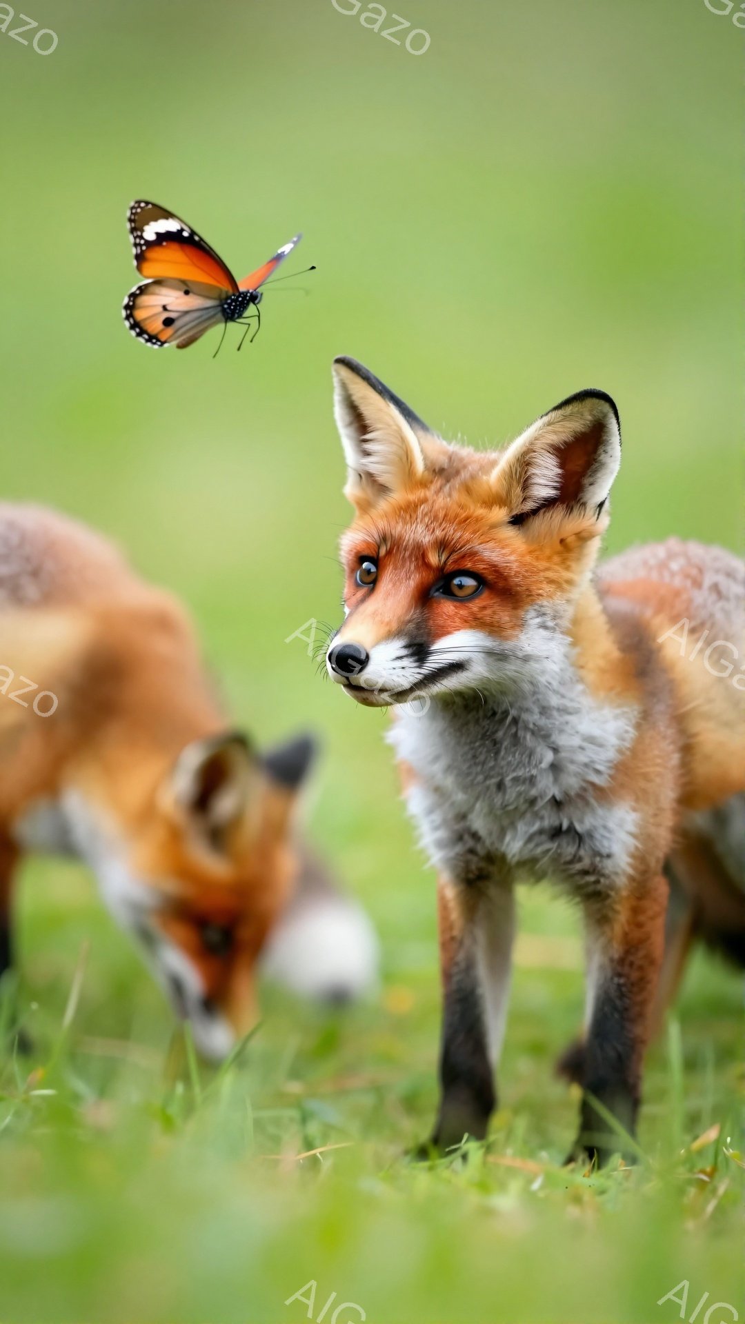 二匹のキツネが緑の草むらに佇んでいます。一匹は好奇心旺盛な表情で何かを見つめており、もう一匹は少し後ろに位置して、同じ方向を見守っています。背景には柔らかい光が差し込み、穏やかな雰囲気を醸し出しています。