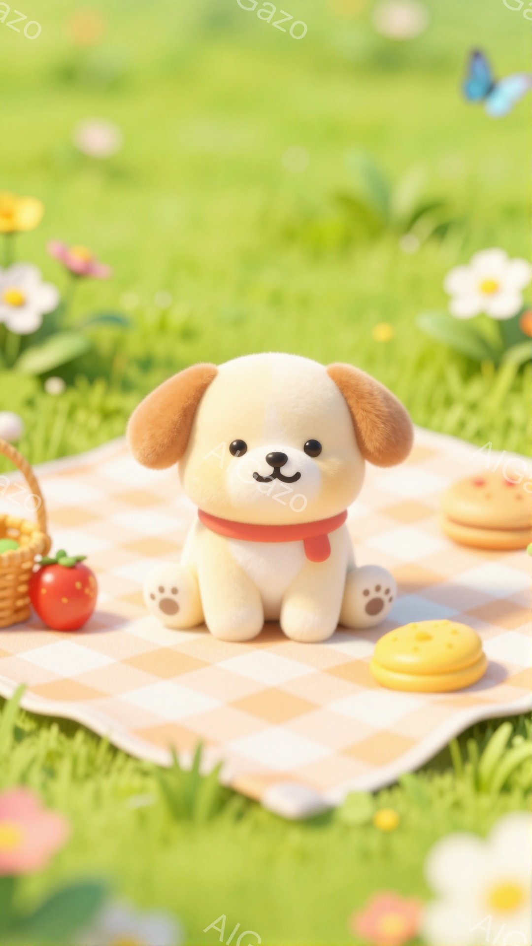 ふわふわのクリーム色のパピーが、ピンクと白のチェックのブランケットの上に座っています。パピーは茶色の耳と、明るい黄色の首輪をつけており、背景には緑の草と色とりどりの花が咲き乱れています。穏やかで平和な雰囲気の、春のピクニックのようです。