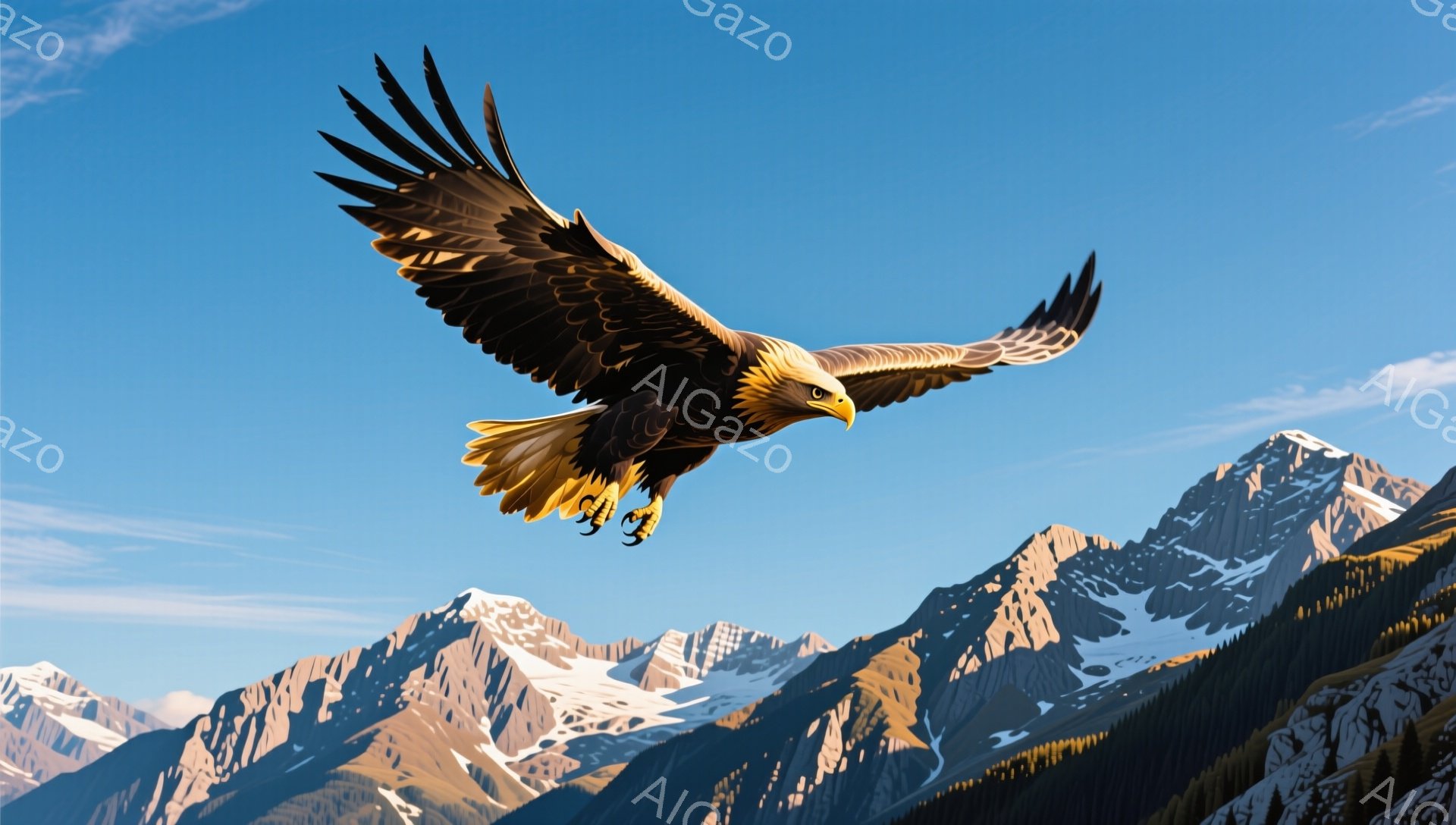 雪山を背景に、翼を広げたアメリカワシが飛んでいる。青い空と白い雪のコントラストが印象的で、ワシの力強い姿が際立っている。太陽の光がワシの羽に当たり、輝きを増している。
