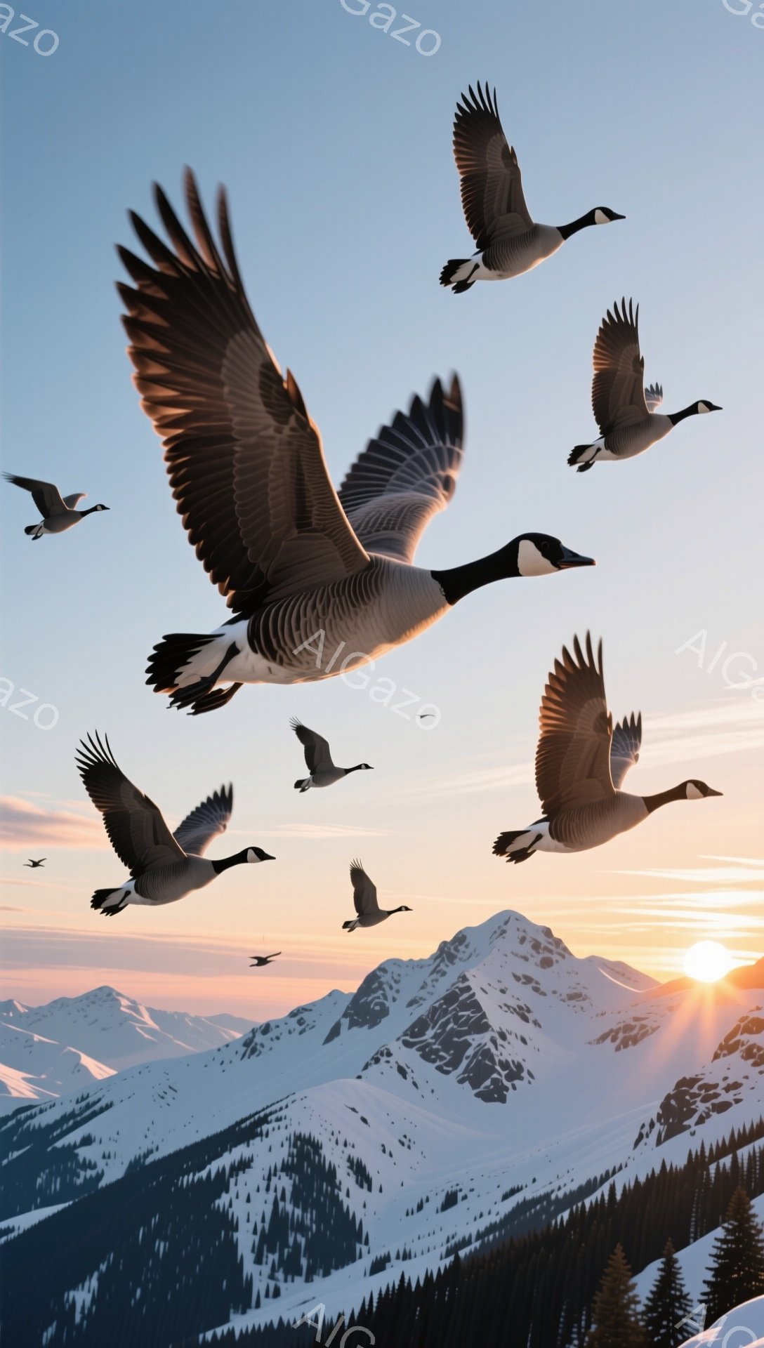 Several geese are flying in formation against a backdrop of snow-capped mountains. The setting sun casts an orange glow on the mountain peaks, creating a fantastical atmosphere. The sky is a pale pink, evoking a sense of winter stillness and natural beauty.