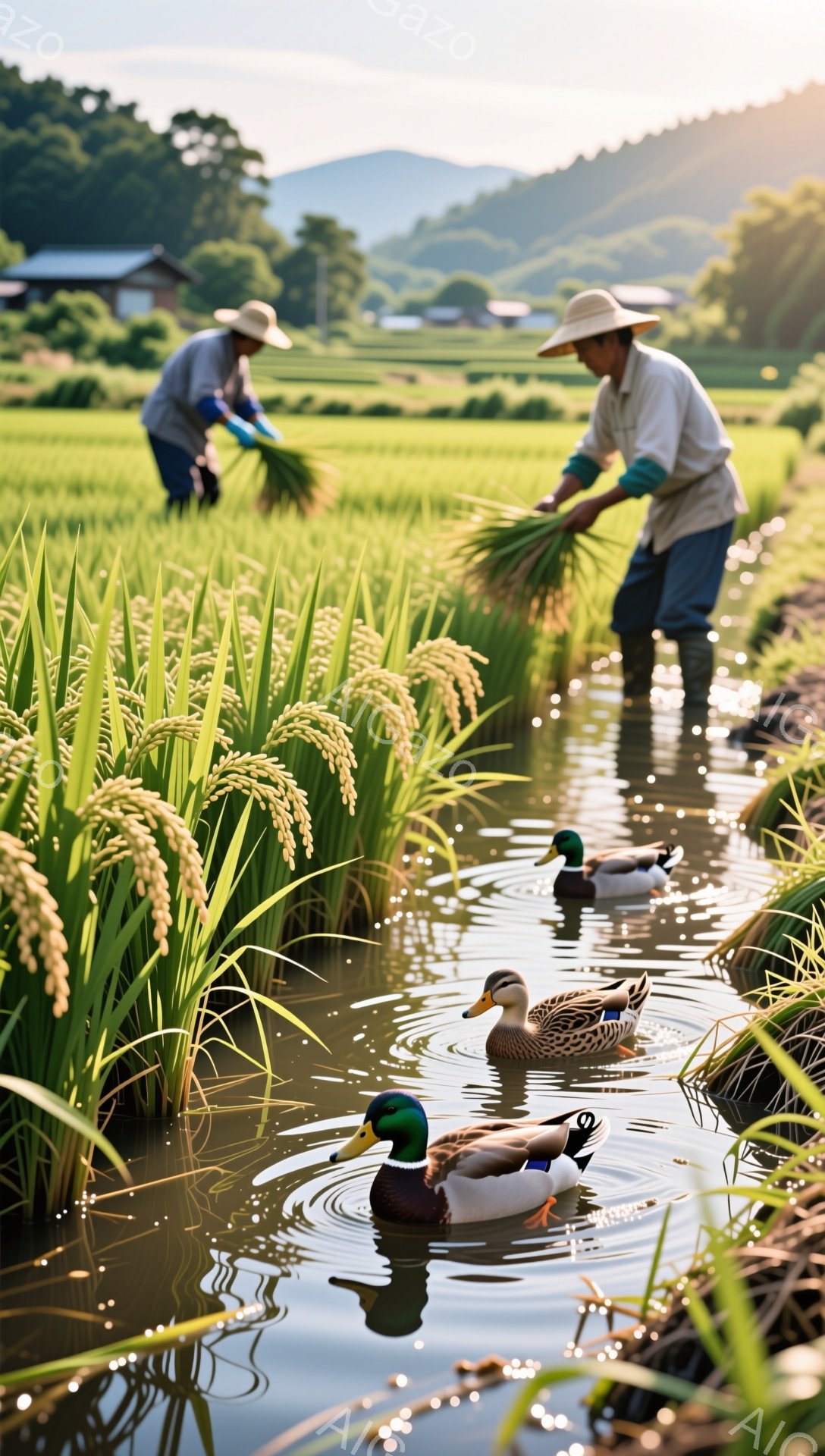 The image depicts people working in a rice paddy alongside ducks. The individuals are wearing straw hats and bent over, tending to the rice plants in the field. The reflection on the water surface, combined with the serene ducks, creates a peaceful and idyllic rural scene.