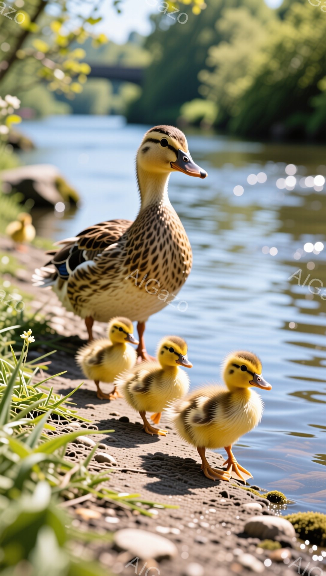 A mother duck walks alongside her three ducklings on a peaceful waterside. Warm sunlight illuminates the scene, with a beautiful backdrop of greenery and water reflections. The image evokes a serene and loving atmosphere.