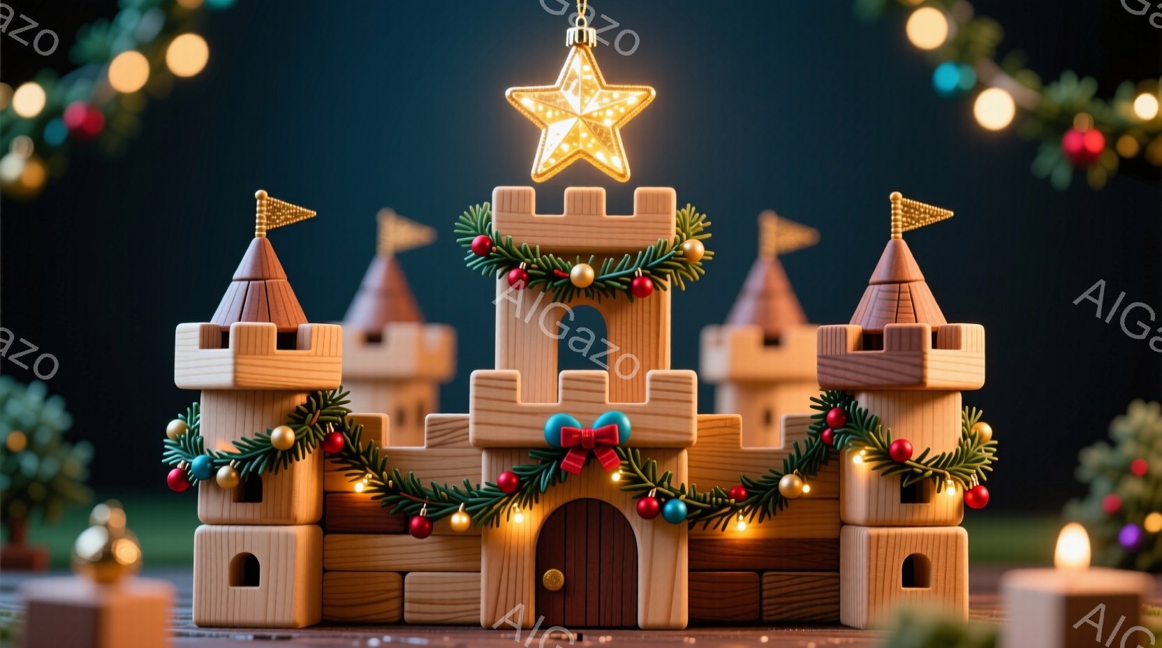 クリスマスをテーマにした木製の城が中央に配置されており、緑のガーランドと赤いクリスマスオーナメントで飾られています。城の最上部には光り輝く星型のオーナメントが輝き、背景にはぼやけたクリスマスツリーと暖色のライトが点在し、温かく幻想的な雰囲気を醸し出しています。全体的に、クリスマスの喜びと魔法を感じさせる、魅力的なシーンです。