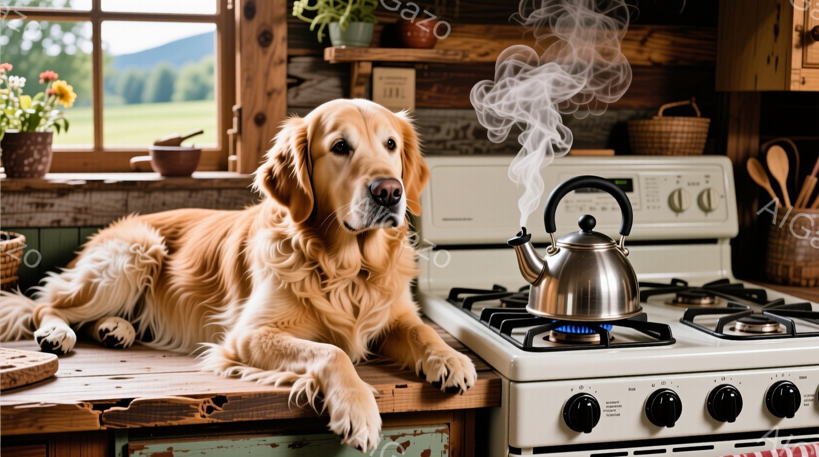 明るいキッチンカウンターの上で、ゴールデンレトリバーがリラックスして横たわっています。スチームが立ち上るケトルがガスコンロに置かれ、犬は穏やかな表情でカメラを見つめています。背景には木製の食器棚と、緑豊かな風景を描いた絵画が見え、暖かく居心地の良い雰囲気を醸し出しています。
