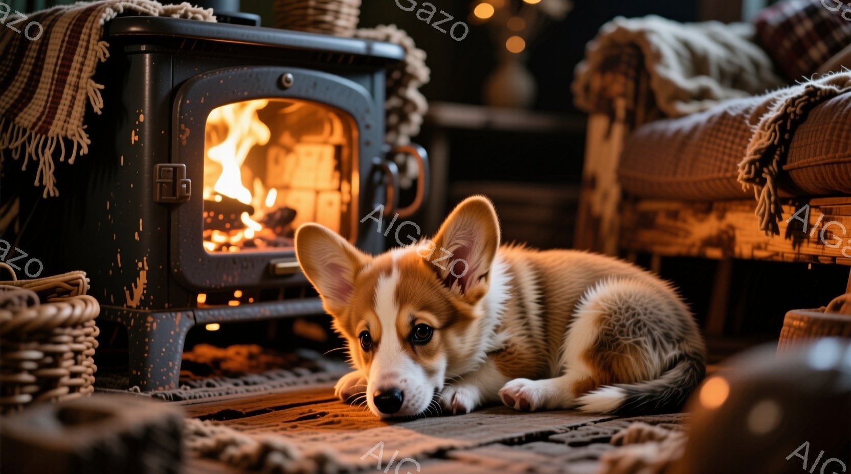 暖炉のそばで、コーギーの子犬が床に横たわっています。子犬は茶色と白の毛並みで、大きな耳と明るい目をしており、リラックスした表情をしています。背景には、籐のバスケットや木製の家具が見え、暖炉の火が温かい光を放ち、居心地の良い雰囲気を醸し出しています。