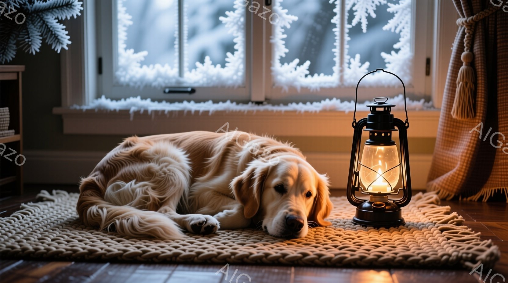 金色の毛並みのゴールデンレトリバーが、手編みのラグの上にゆったりと横たわっています。窓の外は雪景色で、窓枠には霜が降りており、室内にはオイルランプの温かい光が灯っています。全体的に暖かく、穏やかな冬の日の雰囲気が漂っています。