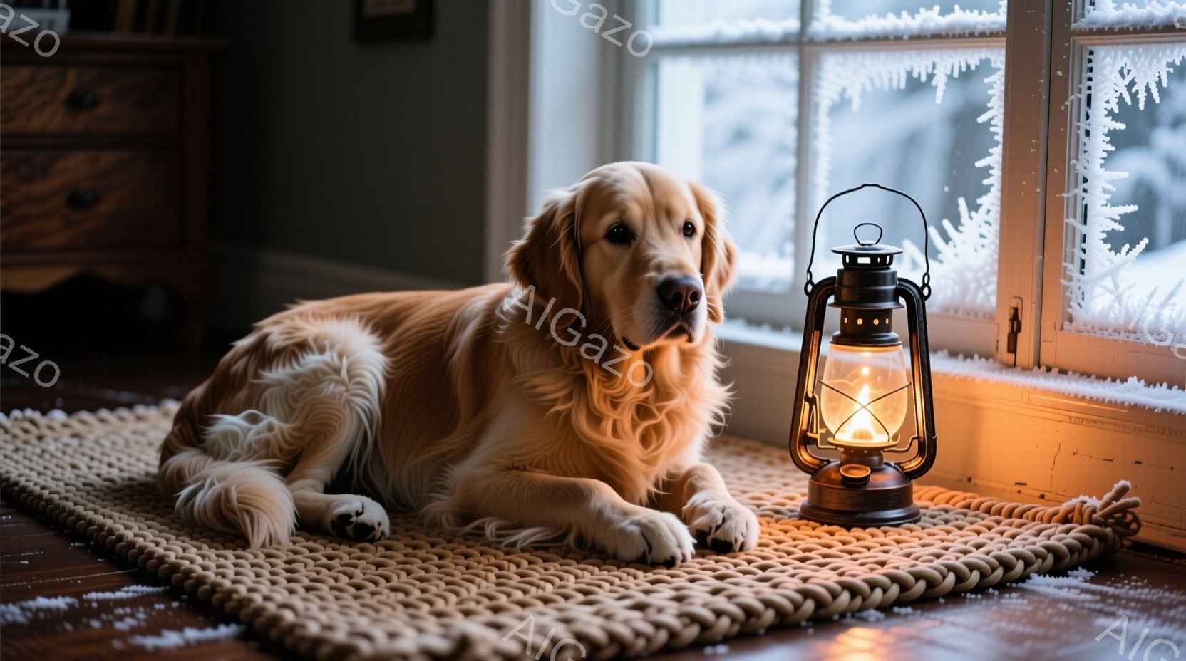 明るい色のラグの上に、ゴールデンレトリバーが横たわっています。窓の外は雪景色で、霜が窓ガラスに模様を描いています。そばには、暖かく光る古いランタンが置かれ、温かい雰囲気を醸し出しています。