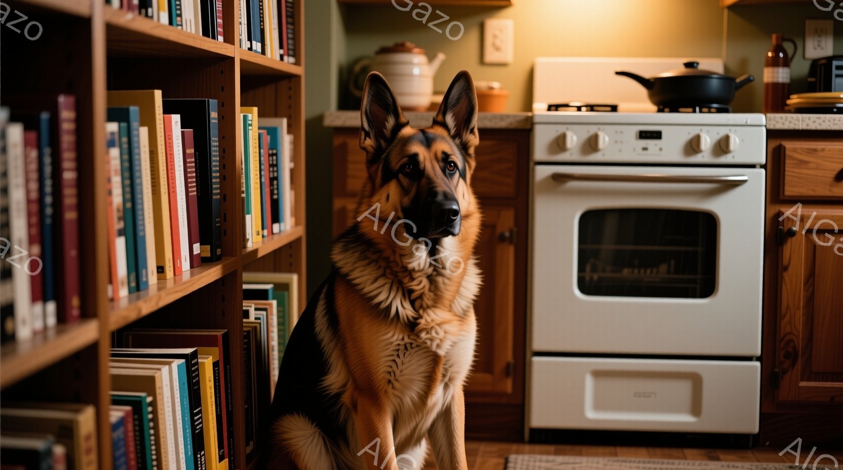 暖炉のそばの本棚の前に、ジャーマンシェパードが座っています。犬は正面をまっすぐ見つめ、その表情は知的で落ち着いています。背景には木製のキャビネットと白いストーブがあり、家庭的な雰囲気が漂っています。