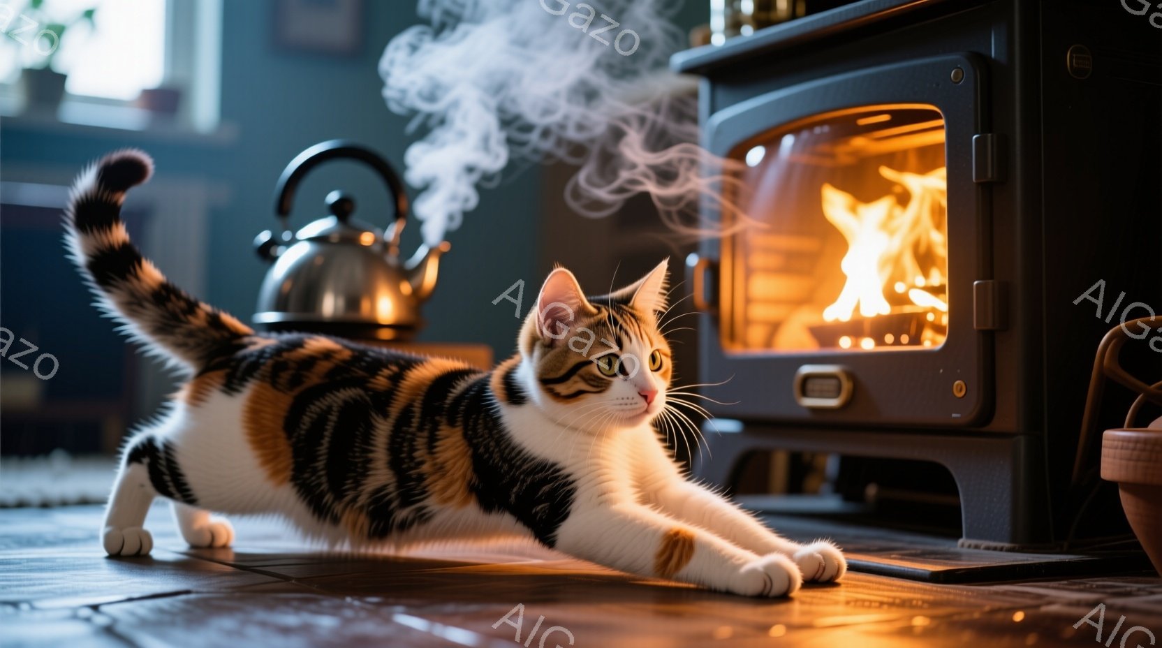 白と黒のまだら模様の猫が、暖炉の前にうずくまり、前足を伸ばして遊んでいます。暖炉からは炎が燃え盛り、背景には湯気を上げるケトルが置かれています。木製の床と暖炉の光が、猫の毛並みを照らし、暖かく穏やかな雰囲気を作り出しています。