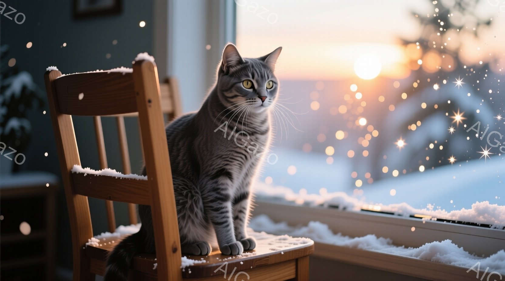 灰色の縞模様の猫が、木製の椅子に座って正面を見つめている。窓の外には雪景色が広がり、夕焼けのような光が差し込んでいる。温かく穏やかな雰囲気で、猫はリラックスした姿勢で、静かに冬の景色を眺めているようだ。