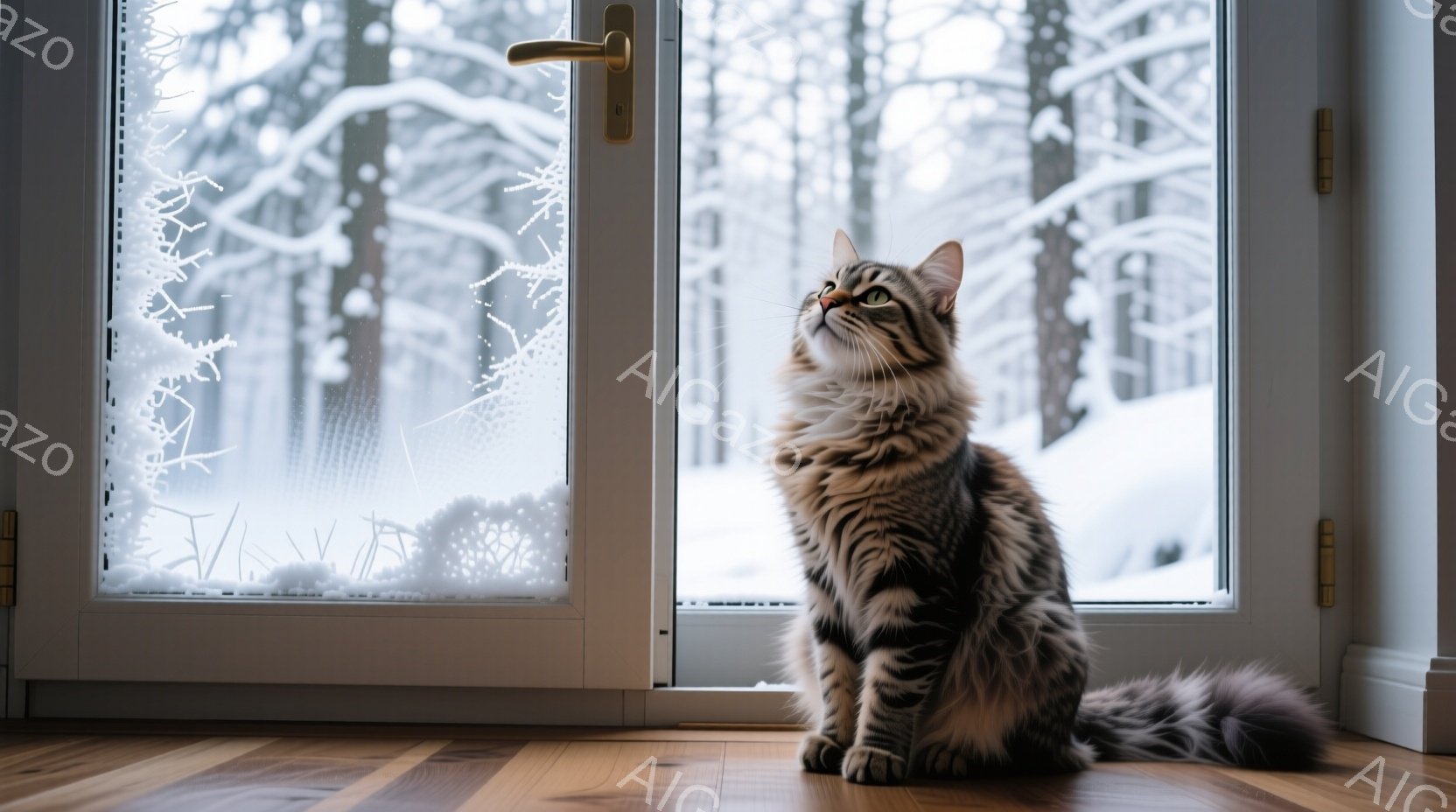 長毛の縞模様の猫が、窓の外の雪景色を眺めて座っています。窓ガラスには霜が降りており、背景は雪に覆われた木々で、冬の静寂な雰囲気が漂います。猫は落ち着いた様子で、木製の床に座り、日差しを浴びているように見えます。